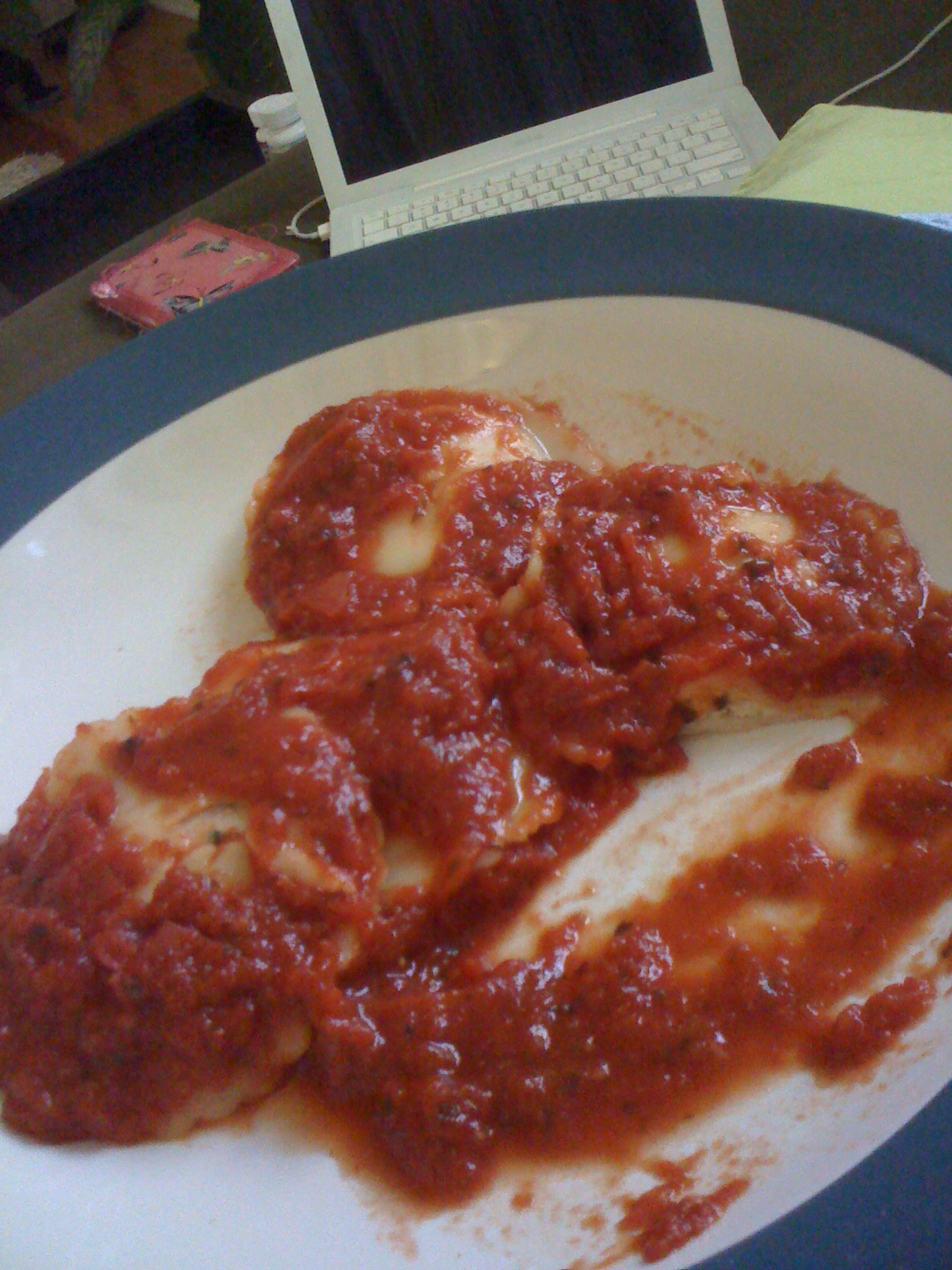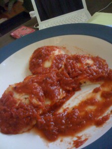 Husband and I went to Trader Joes to shop for ingredients for a dinner we are hosting tonight. Cooking ribs is gonna be REAL interesting. But I digress. While at the grocery store I suddenly had an overwhelming craving for chicken ravioli from Earth, Wind, and Flour. Now, I’ve never actually eaten them before, but they sounded delicious. And they were! I think I need lycopene or something…