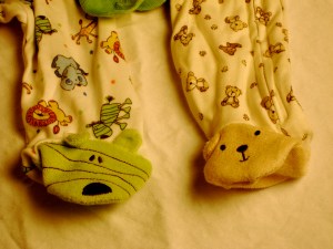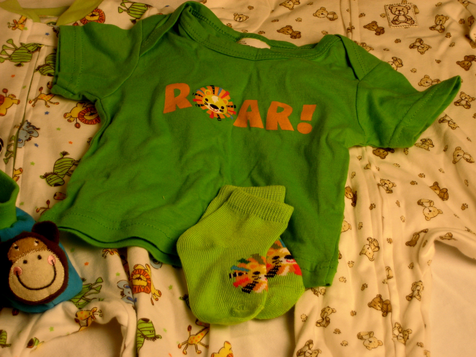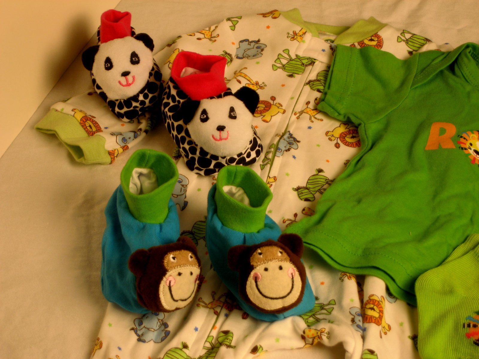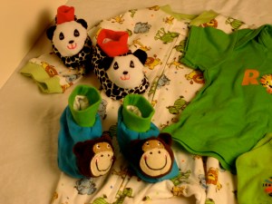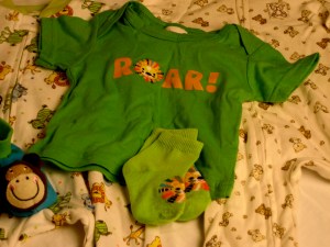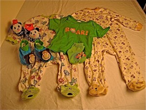 Baby’s first clothes.  Ever.  These adorable pieces came from Denise Vivaldo; client, mentor, friend.  The animal footie onesies are killing me.