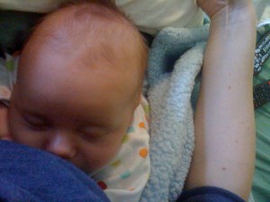 After nursing, Ian likes to wiggle himself down under my boob and nap. He has his little legs tucked under his little butt, and his arms crossed under his chin.  Cannot stand the cuteness.