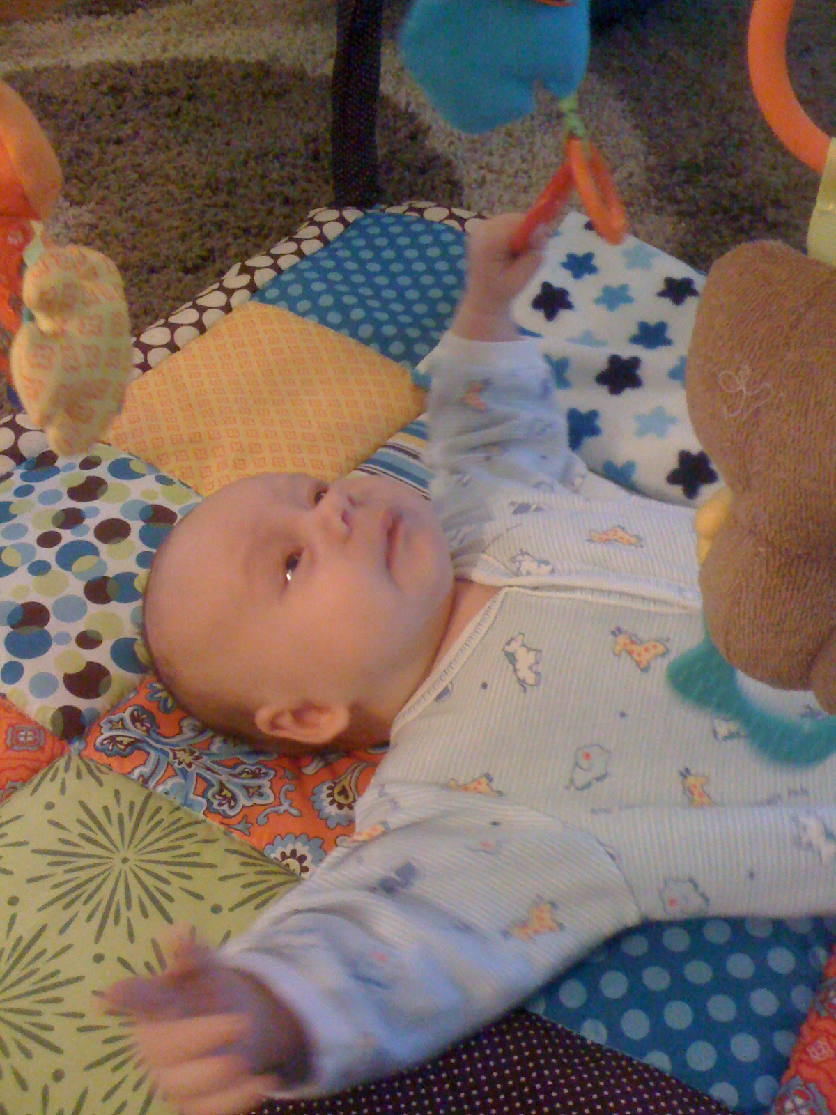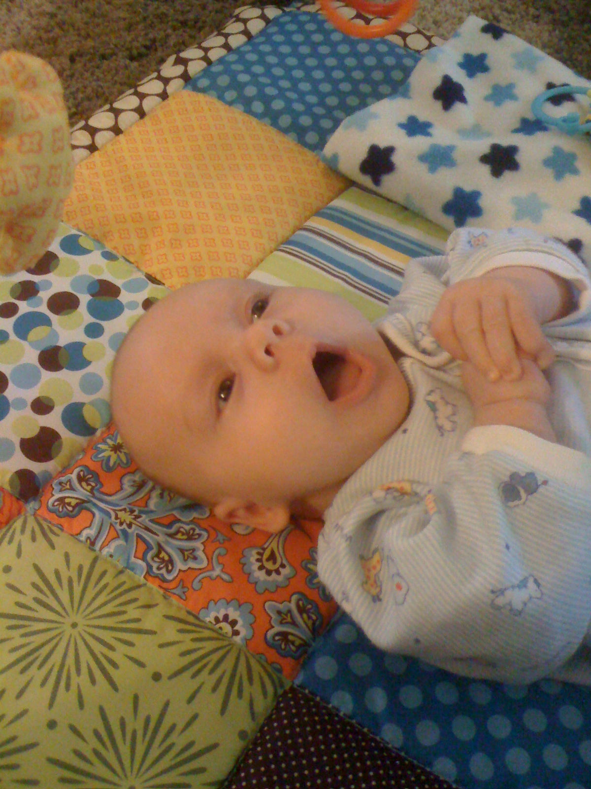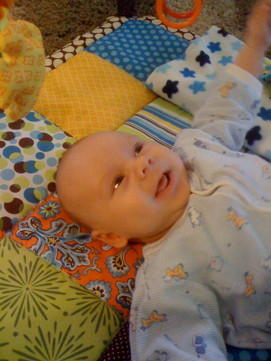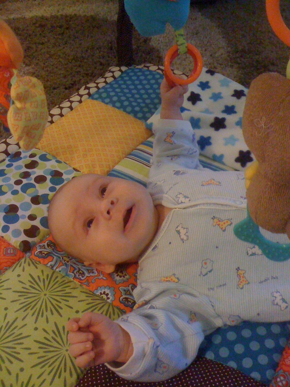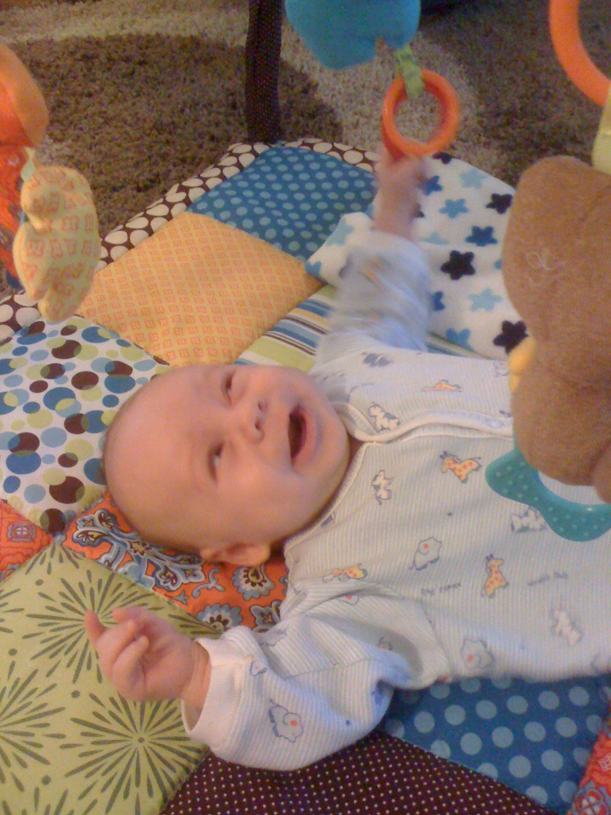 You start the day with a healthy breakfast.Then you decide you like the Activity Gym.Must put fist in mouth. I'm opening my mouth as wide as I can.Hoooray for the Activity Gym!Gurgle gurgle coo coo.What happened?I grabbed the ring! Whatever that means...The ring is not letting go...I'm happy/freaked out.Well, you know where to find me.