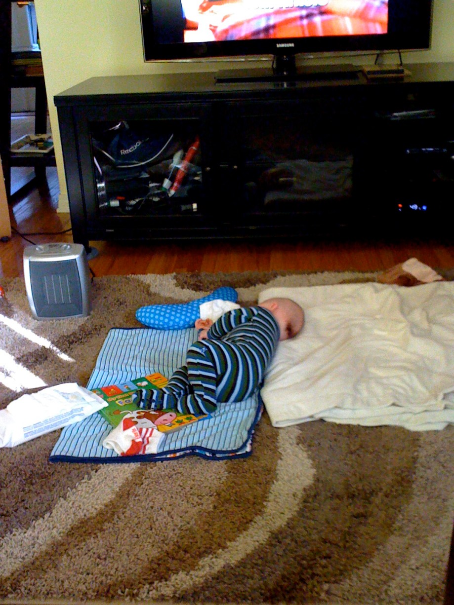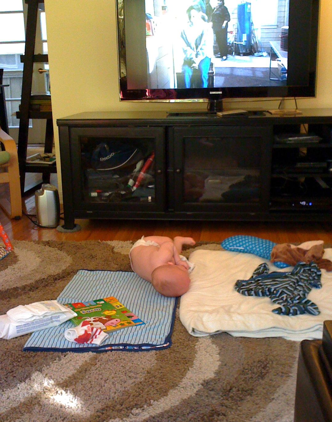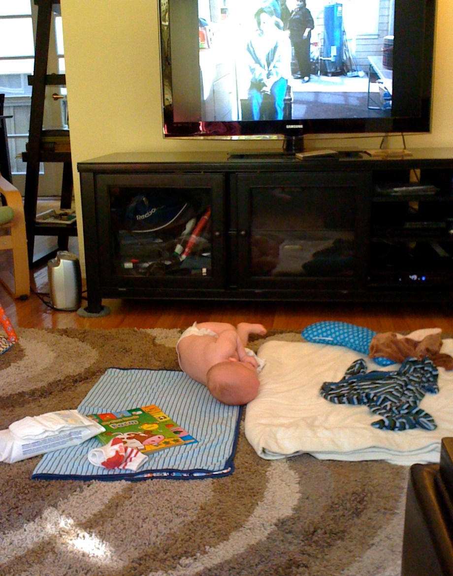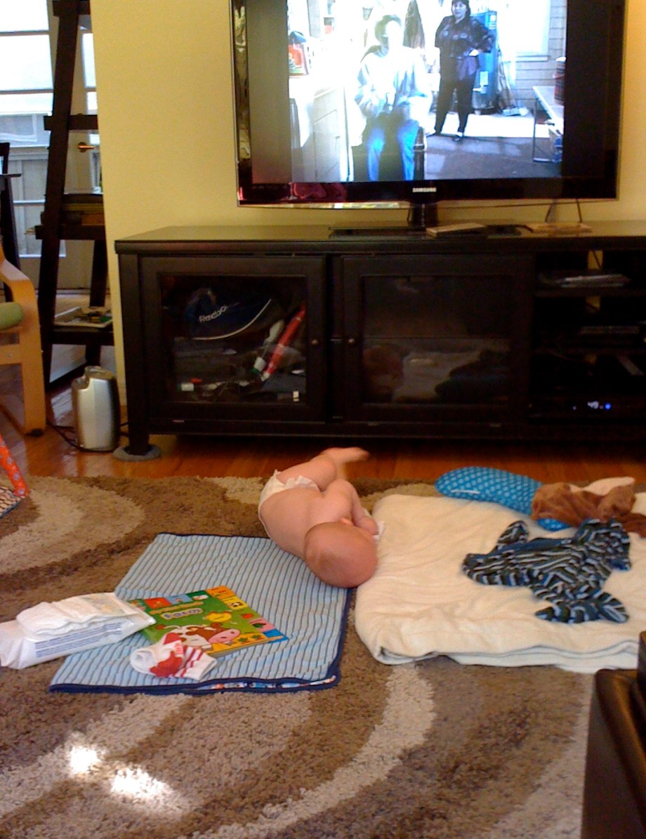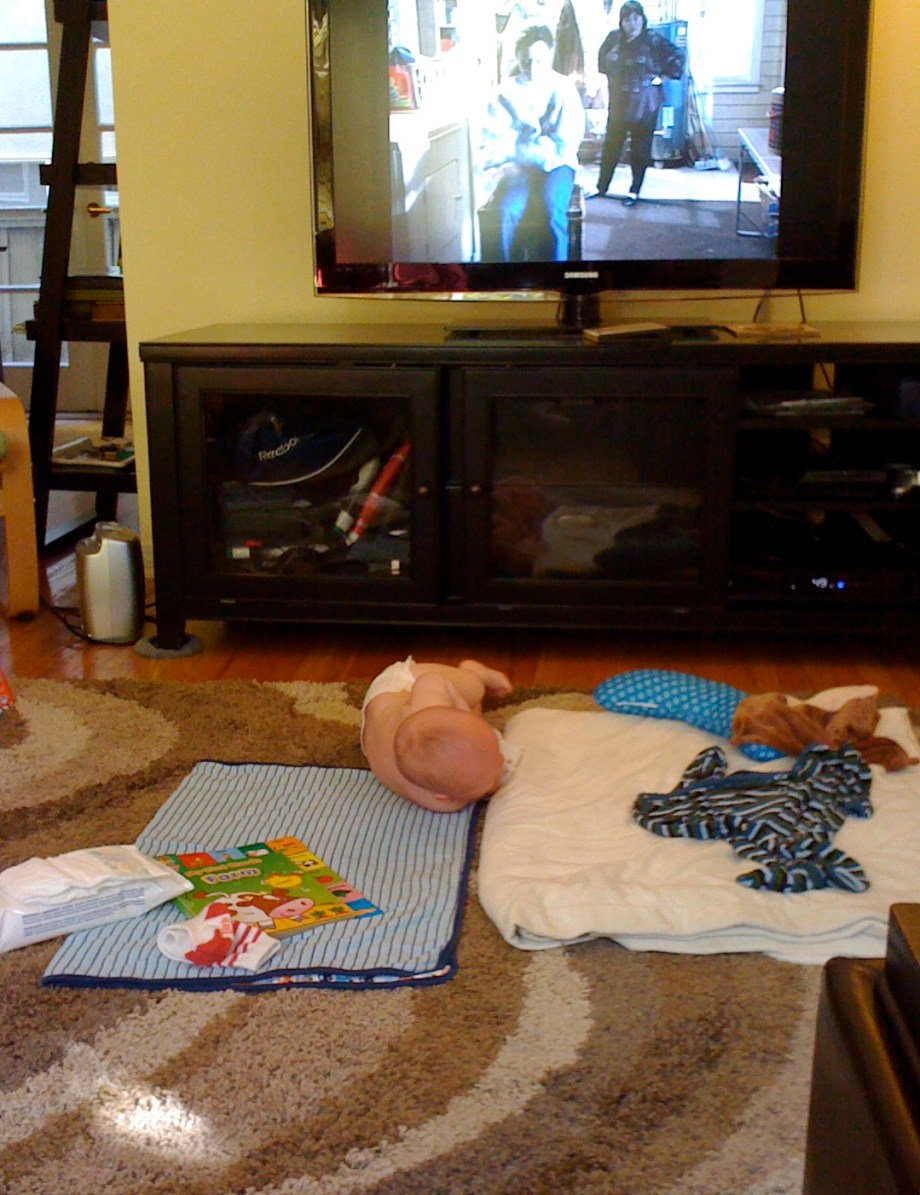 No, she’s cheering herself up watching Roseanne reruns and watching her son completely exhaust himself trying to roll over.