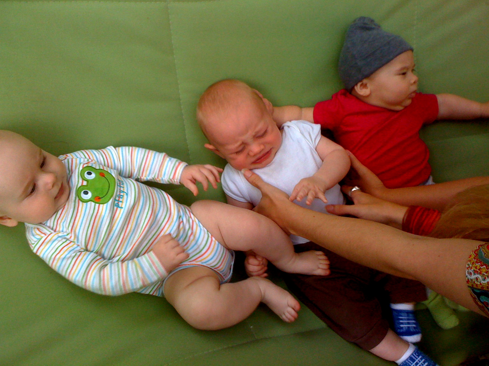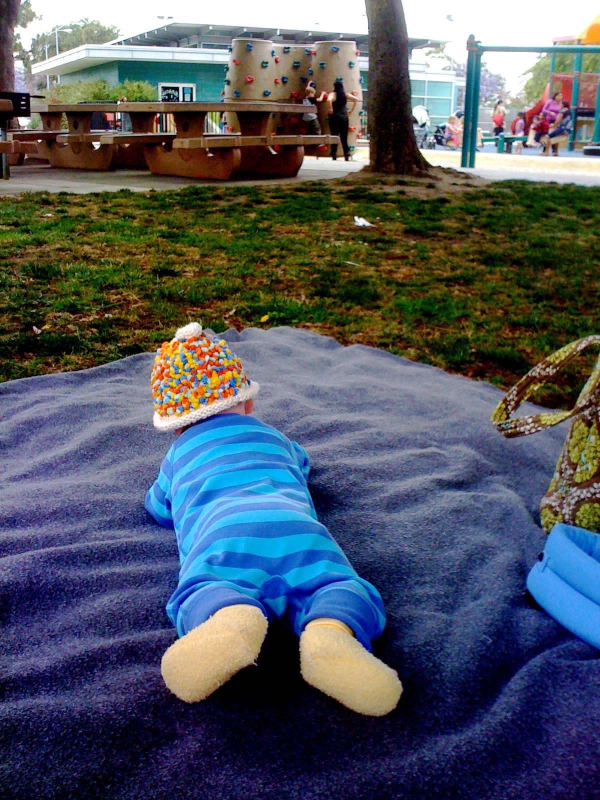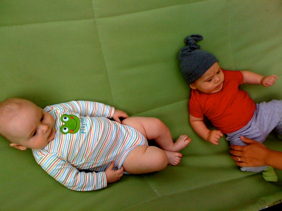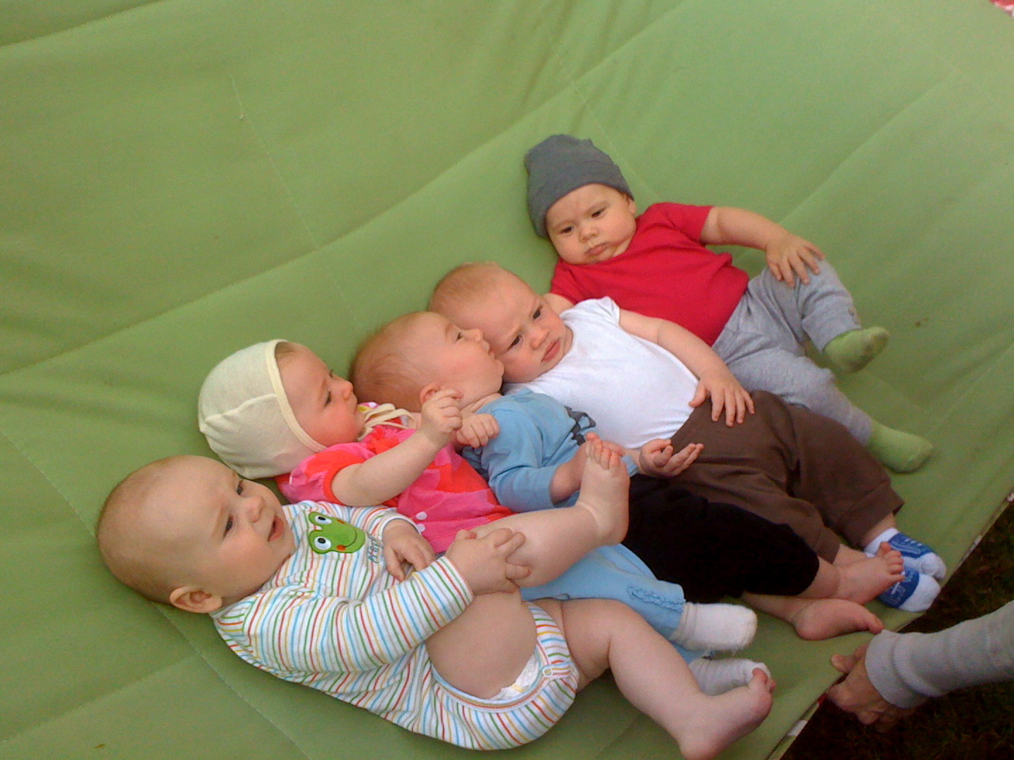 Sanctuary Baby reunion at Summer's yesterday. Babes are in birth order: Ian 1/1, Noli 1/11, Eliseo 1/16, McClure 1/18, & Mila 1/26 (mamas please correct me if I messed any dates up). Ian and Mila are slapping their thighs in mirth and jubilance.And then there were three. McClure owes Ian and Mila a good scratch/kick/barf/whathaveyou.Mom to the rescue!Here comes Mila's mom...All by myself in the big green hammock.This morning mom cut my pinky trying to clip my nails. She froze but luckliy dad was on the case and patched me up with two tiny butterfly bandages.First boo boo.Then we went to the park for mom's group, but no one showed up except our best buds Mila and Erika.Mom thought it was perfect park weather (65 degrees and overcast, no wind), until my lips started to match my outfit.So we blew that joint and went shopping. Can you see my two little nubbins? I'm working on it!