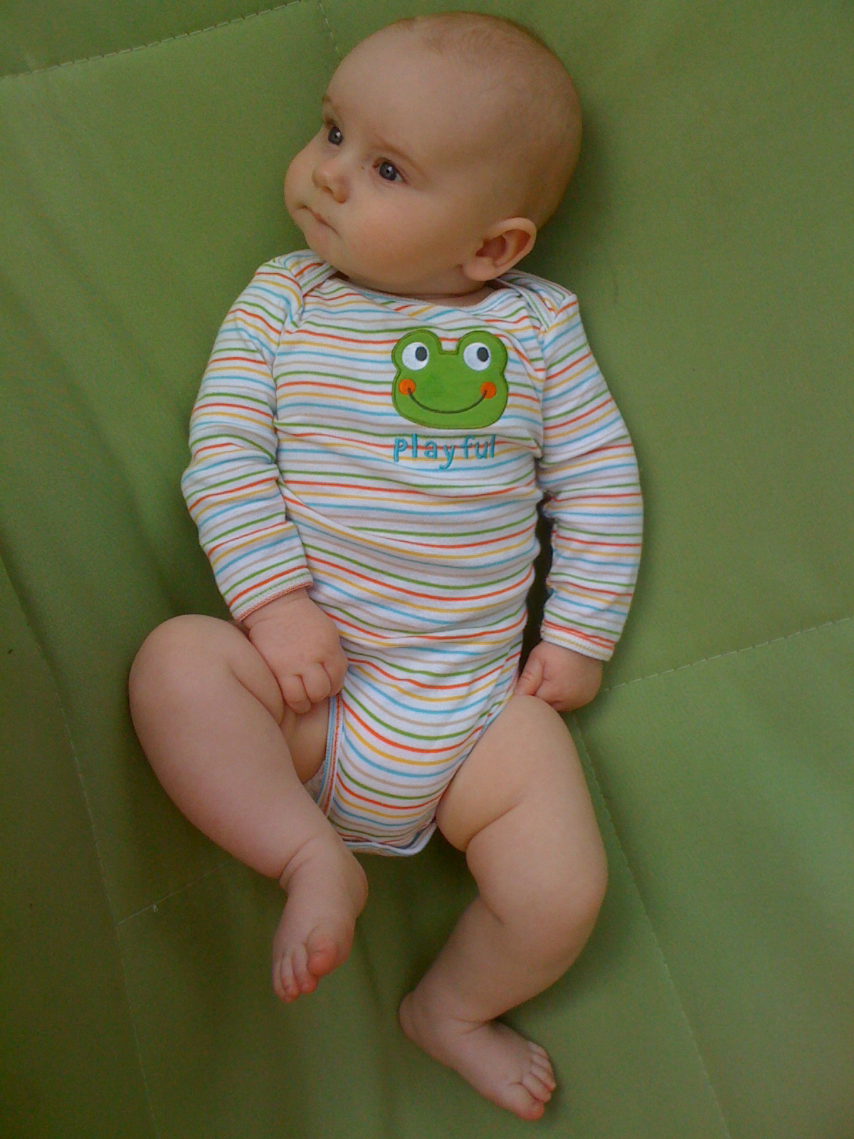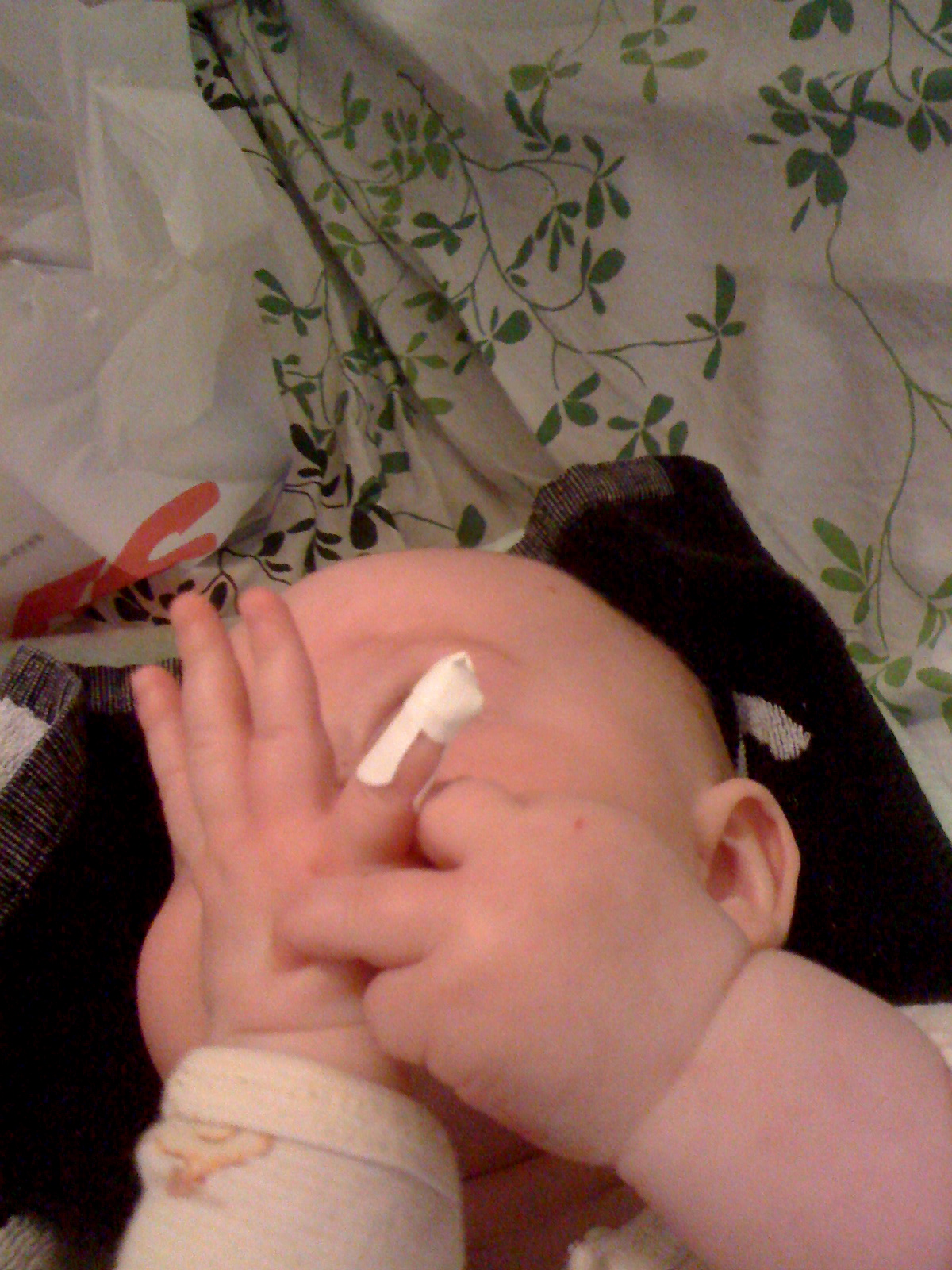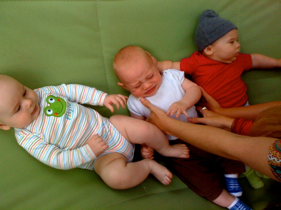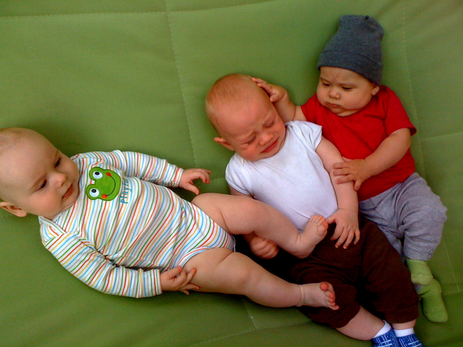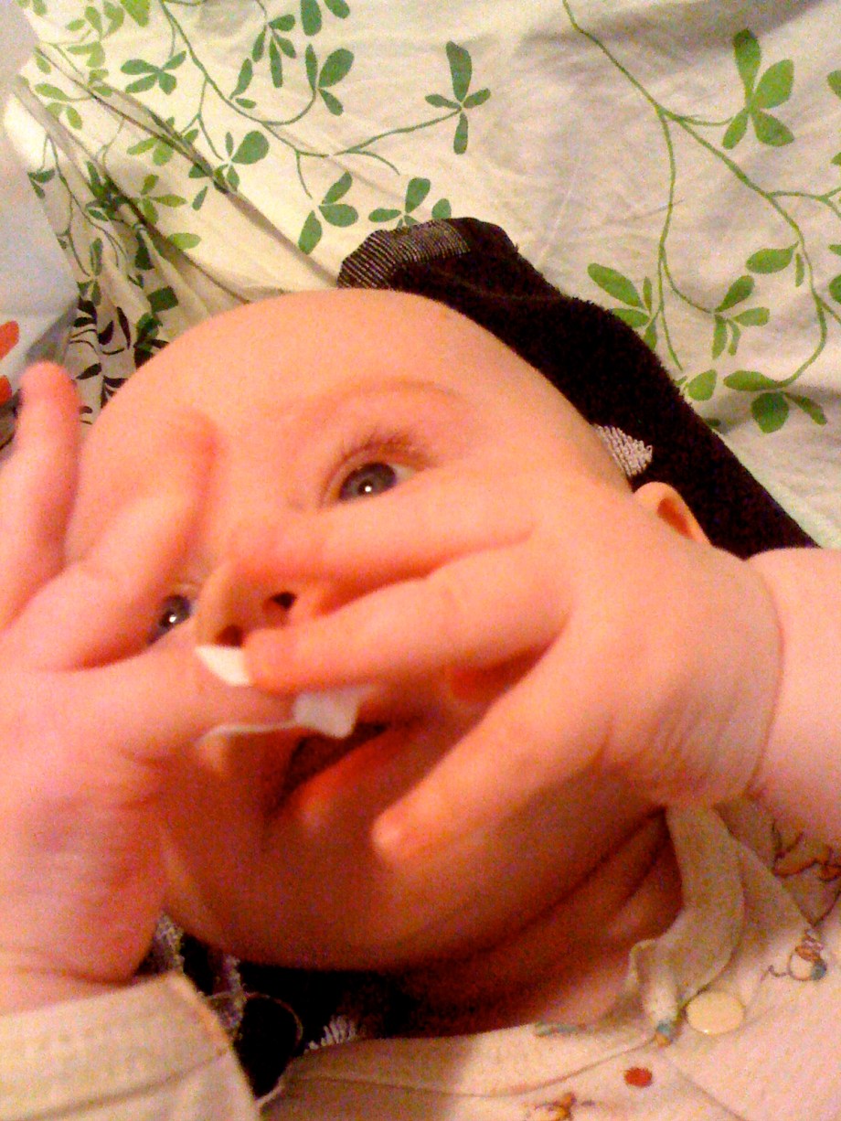 Sanctuary Baby reunion at Summer's yesterday. Babes are in birth order: Ian 1/1, Noli 1/11, Eliseo 1/16, McClure 1/18, & Mila 1/26 (mamas please correct me if I messed any dates up). Ian and Mila are slapping their thighs in mirth and jubilance.And then there were three. McClure owes Ian and Mila a good scratch/kick/barf/whathaveyou.Mom to the rescue!Here comes Mila's mom...All by myself in the big green hammock.This morning mom cut my pinky trying to clip my nails. She froze but luckliy dad was on the case and patched me up with two tiny butterfly bandages.First boo boo.Then we went to the park for mom's group, but no one showed up except our best buds Mila and Erika.Mom thought it was perfect park weather (65 degrees and overcast, no wind), until my lips started to match my outfit.So we blew that joint and went shopping. Can you see my two little nubbins? I'm working on it!