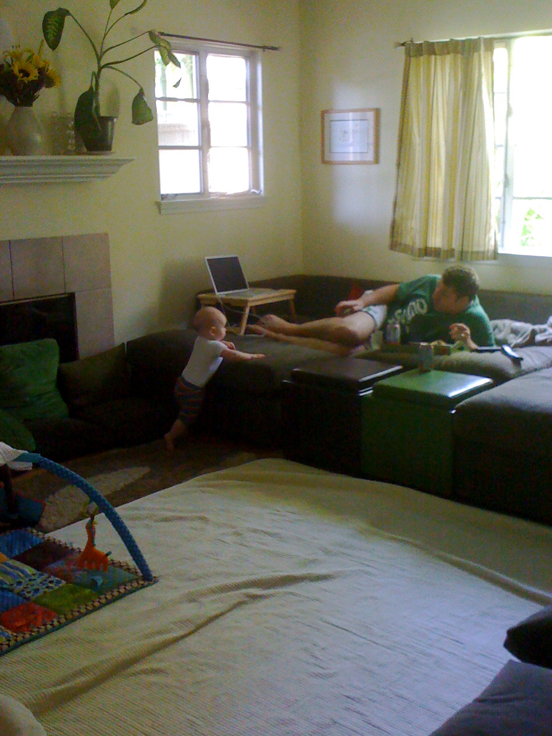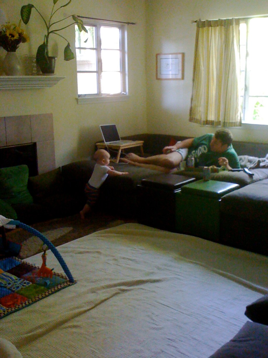 He’s pulling himself up to standing! His favorite spot to do this is the ottoman in front of the couch to check out dad’s computer.