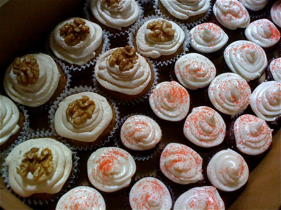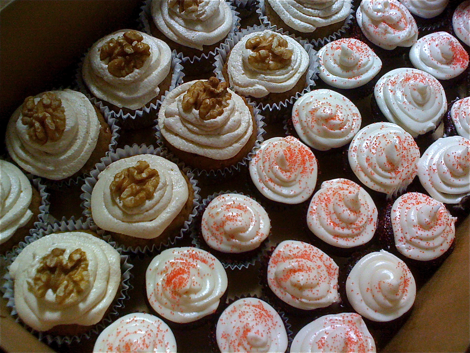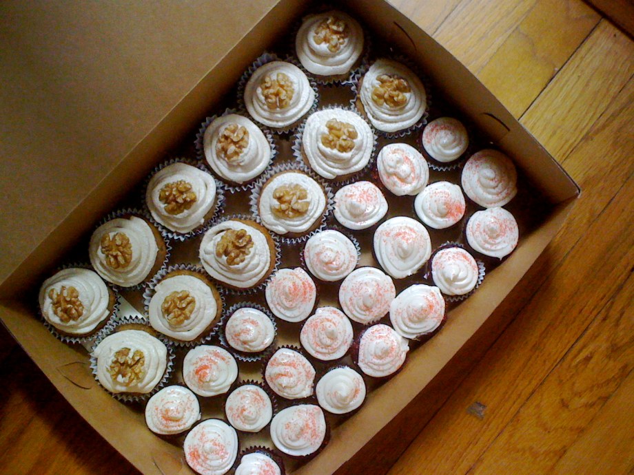 I will leave you with a few scrumptious shots of the cupcake order I fulfilled this morning. Banana Walnut with Spiced Buttercream, and Baby Red Velvets with Cream Cheese Frosting. All vegan. It’s all I can do not to have frosting for breakfast.