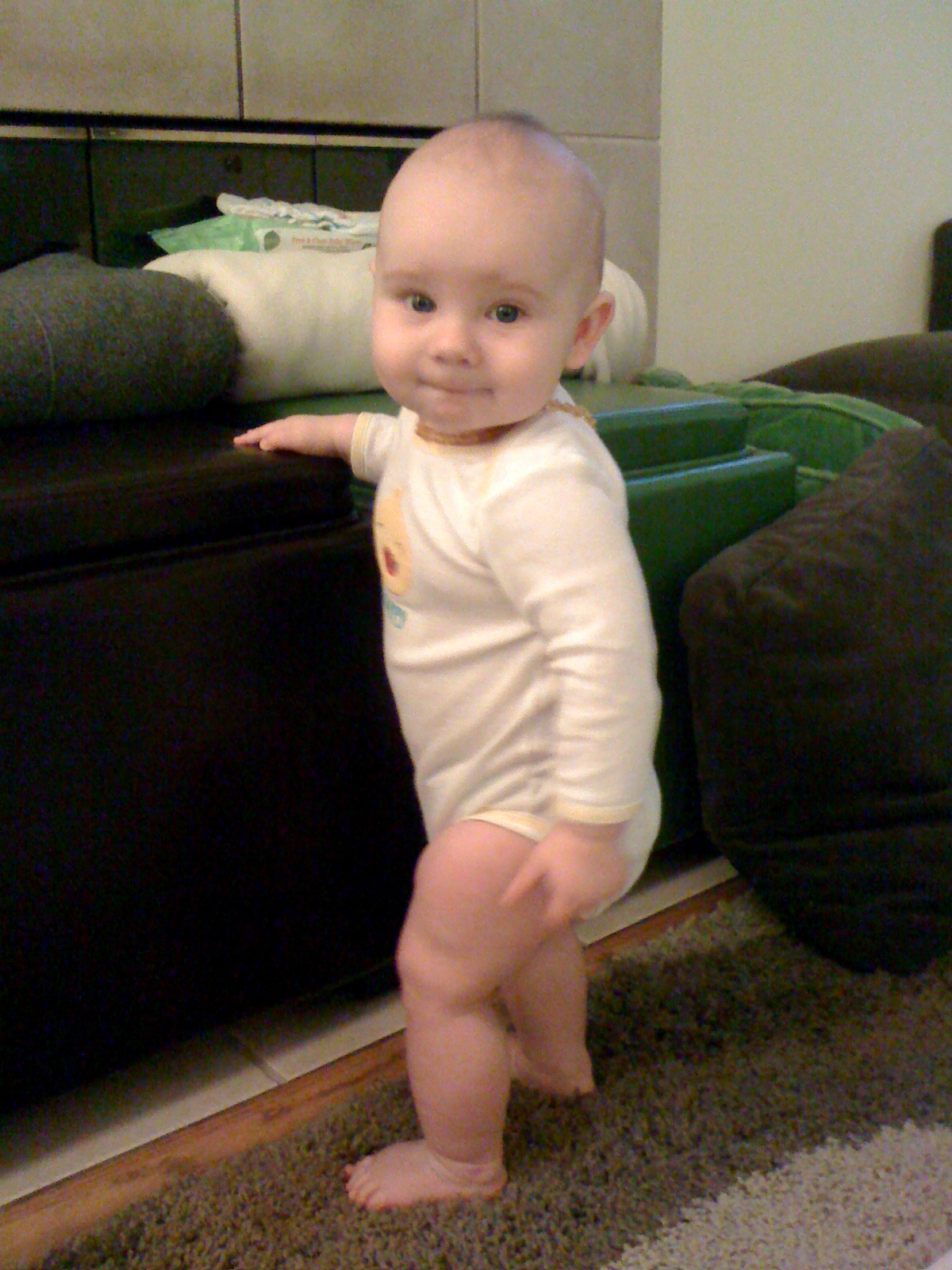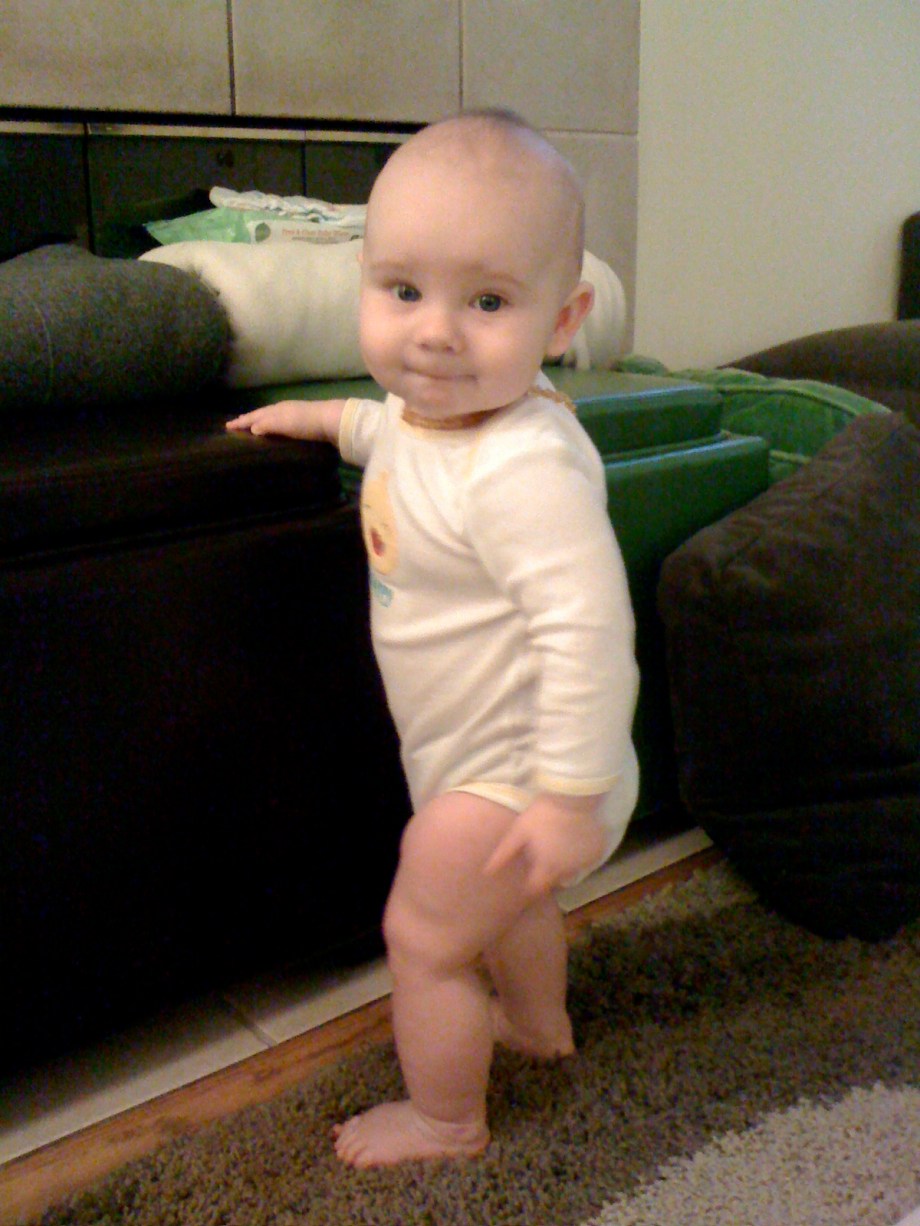 Two teeth. Very clingy. Stranger anxiety. Runny nose (from teething). Cruising. Reaching for everything. Sleeps through the night. Sleeps through smoke detectors.