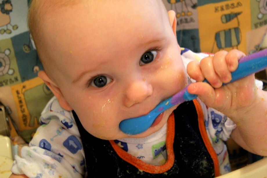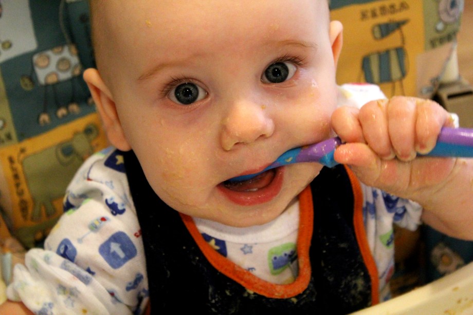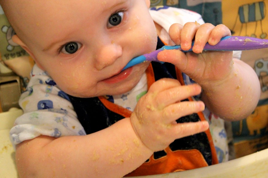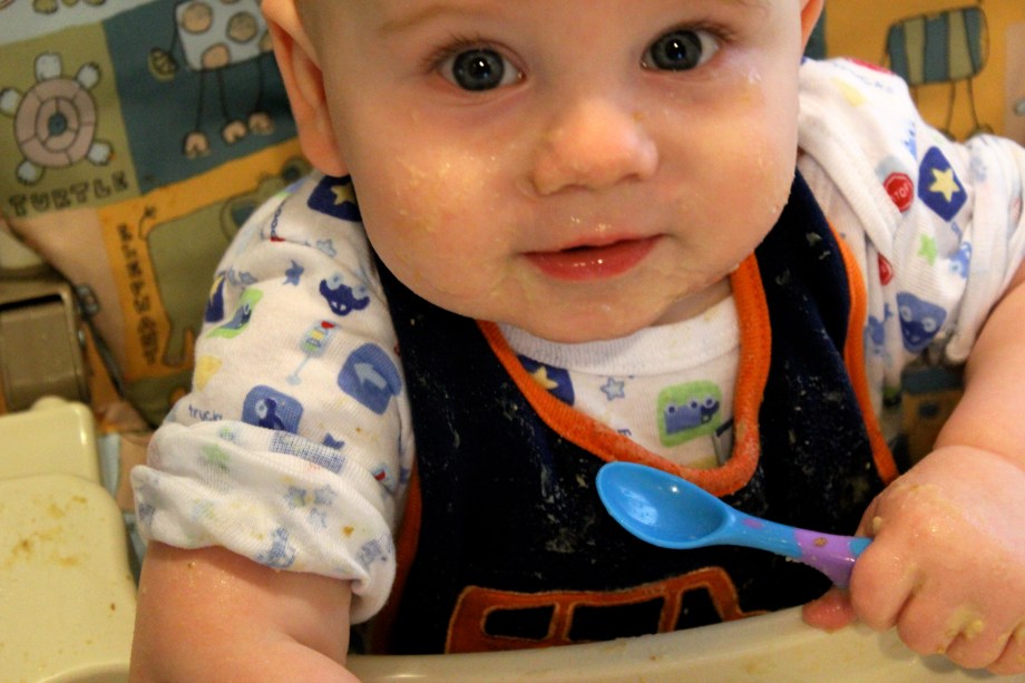 Today I put him in the high chair and gave him some hummus on the tray and let him have a party. After he covered himself and the tray in hummus, he ate a lot of it off himself and the tray. Yes, he has hummus in his eyelashes. I’m okay with that.
