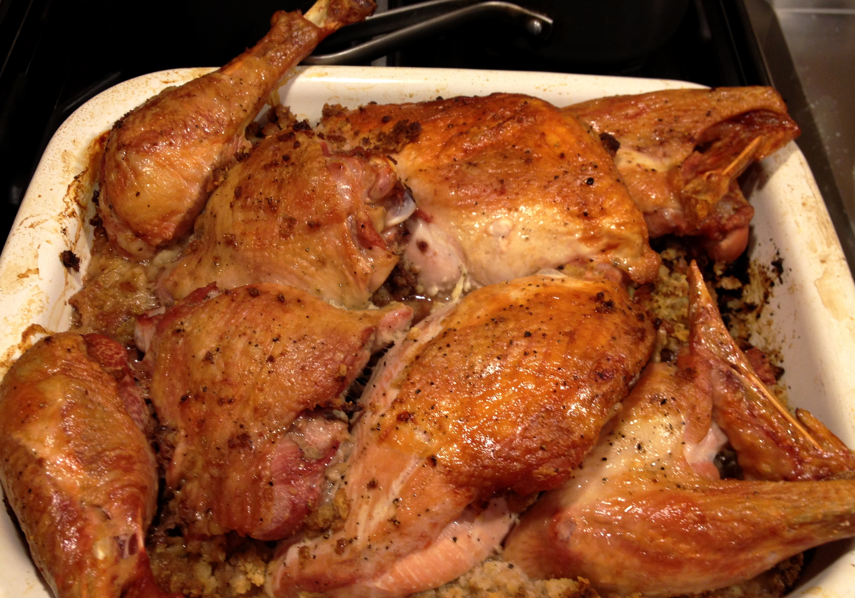 As my friend and client, Denise, wisely told us, cut your turkey and put it on top of the stuffing. Done in an hour and a half, juicy with crisp skin, and the stuffing has soaked up all the drippings. Swoon.