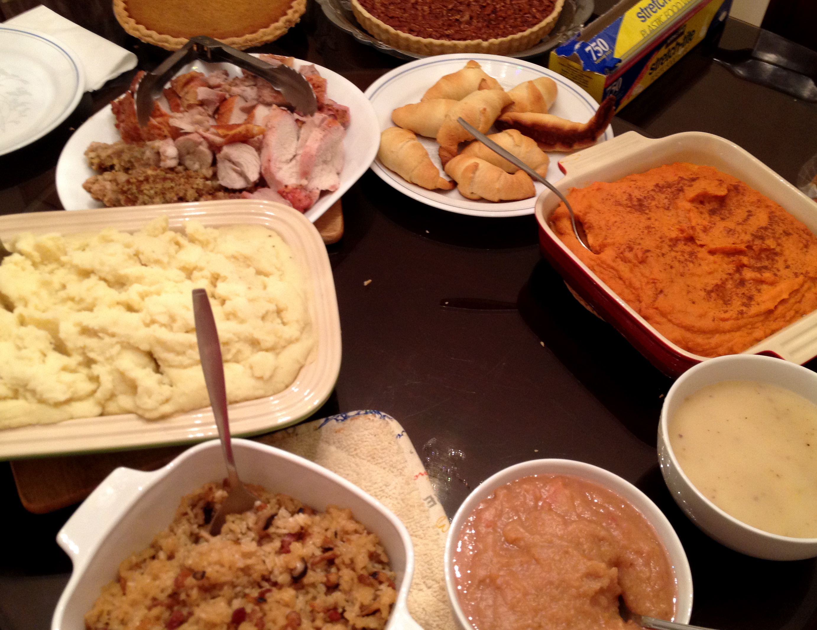 The spread on a lazy susan at Tiff’s house. Two kinds of stuffing, apple/pear sauce, gravy, mashed potatoes, rice made by Chinese grandma, bread, two pies. Nary a green vegetable. My slow cooked broccoli was a fail (I revived it the next day tho- more on that later).
