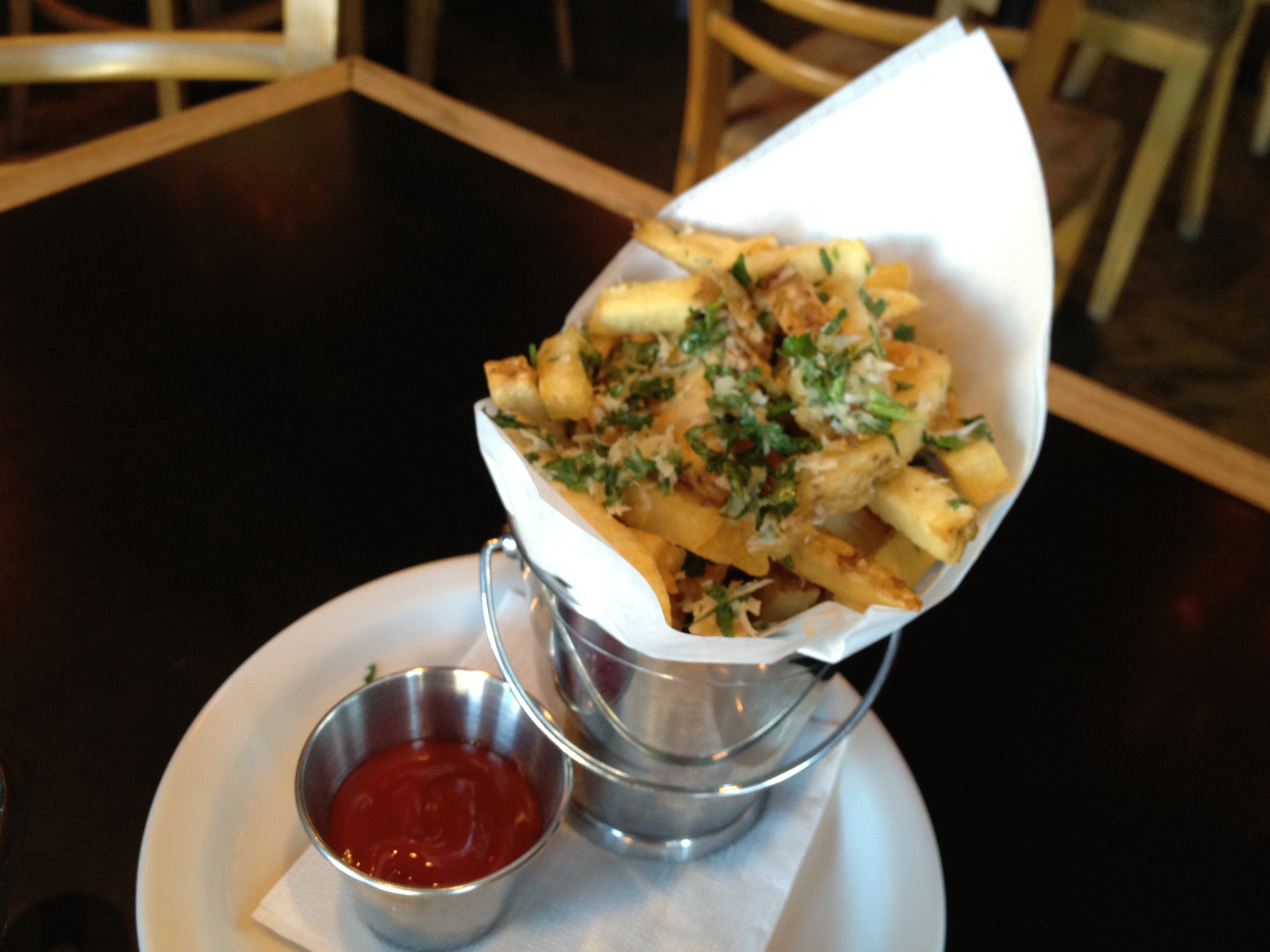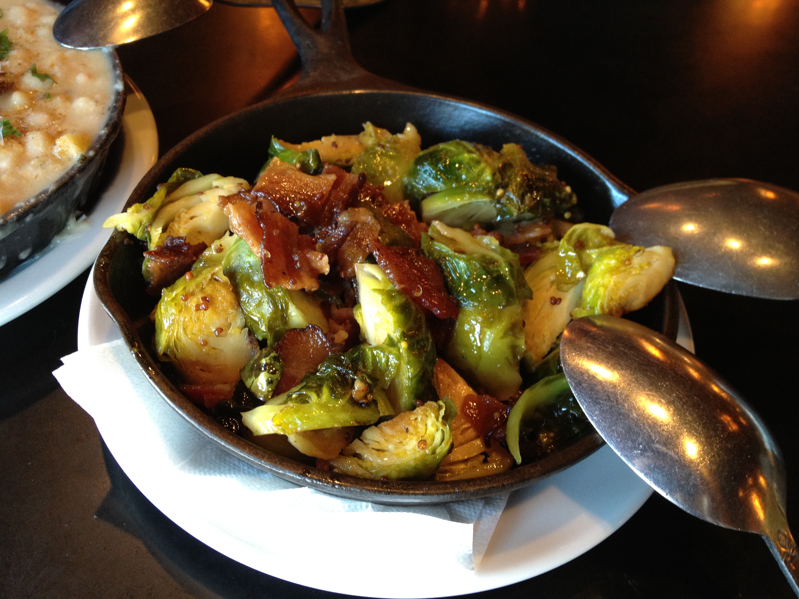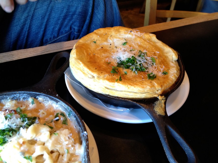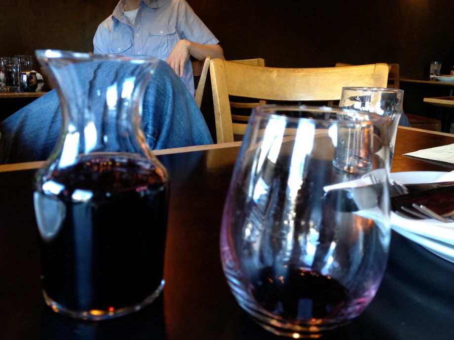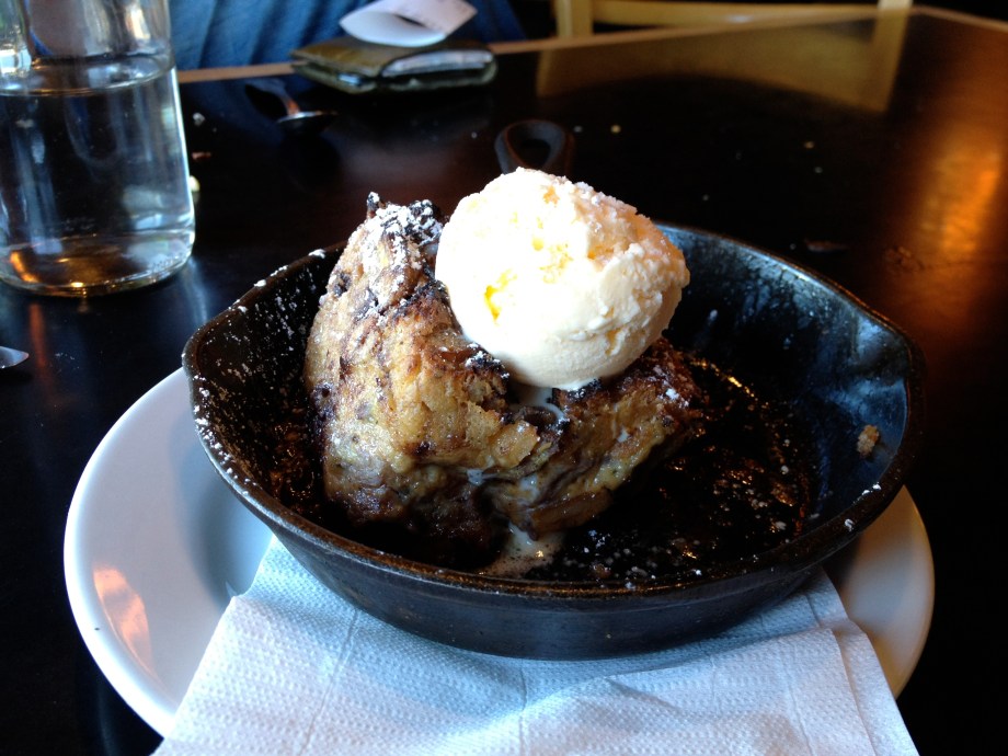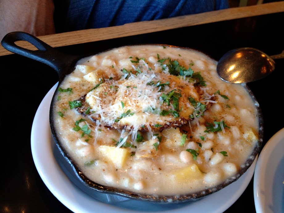 Date afternoon. You can tell because I'm wearing my pearls, courtesy of husband's friend and mentor. Thanks again, Suzanne! They're stunning.At The Six, with husband. We had a little wine.I liked the vibe of The Six a lot. No Gjelina or Tasting Kitchen pretense, with a very similar menu. Lots of mention of farm eggs and bacon and roasted things and fancy pizza and mac and cheese.Brussels Sprouts with Bacon, Port, and Mustard. The best dish we had. Easy. Full of flavor, which is very important to me.White Bean Cassoulet with Farm Egg and Parmesan. Bland. Squash was undercooked. Also was served so hot you couldn't taste anything. Loved the presentation.Short Rib Pot Pie. Rib was cooked perfectly, but again lacked flavor. Puff pastry crust was yummy!Parmesan Truffle Fries. Not a drop of truffle flavor. Mealy. We hardly touched them, and that says a lot consdering they were fried and had cheese on them.Chocolate Hazelnut Bread Pudding. Kind of awesome and kind of weird. Was ice cold in the middle, but had been pan fried quickly so was nice and crusty and pleasantly oily on the outside. Nice chocolate and nuts, but had weird slices of banana that was light purple in color (?). Banana added nothing to the dish and wasn't mentioned so would be an unpleasant surprise to a non-banana person.