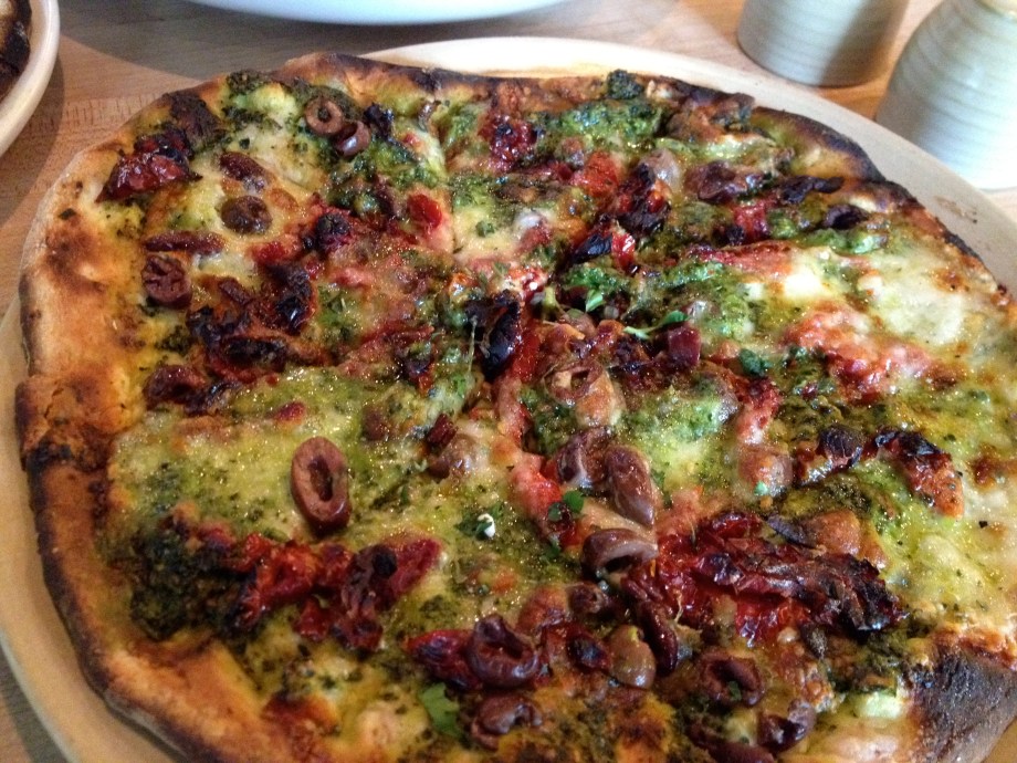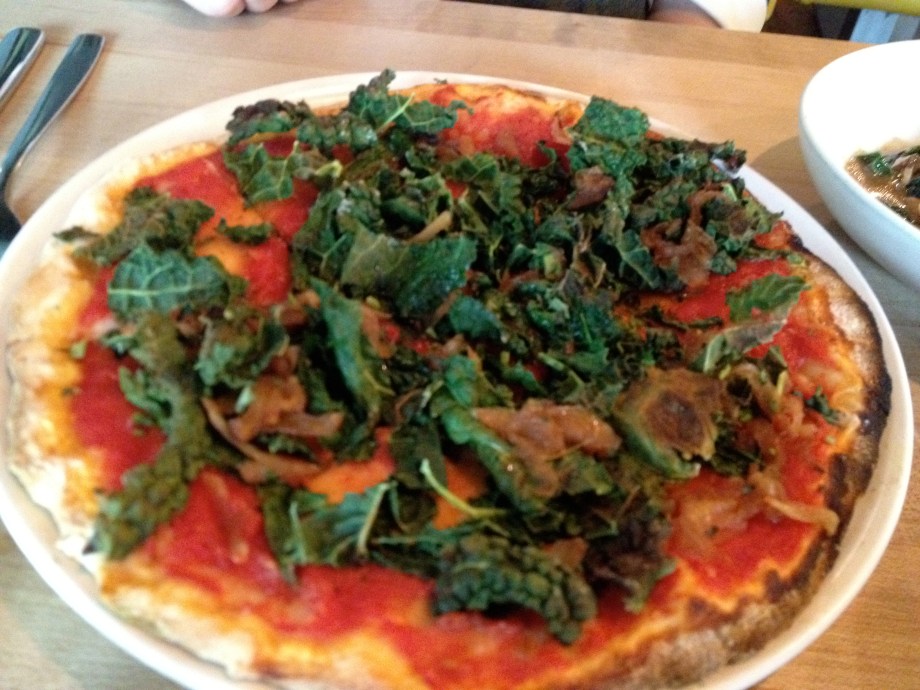 Roasted Kale, Onion, & Garlic Pizza from True Food Kitchen. Spaced on the no cheese thing. Ate the kale and took the tomatoey bread home to make into something else involving cheese.