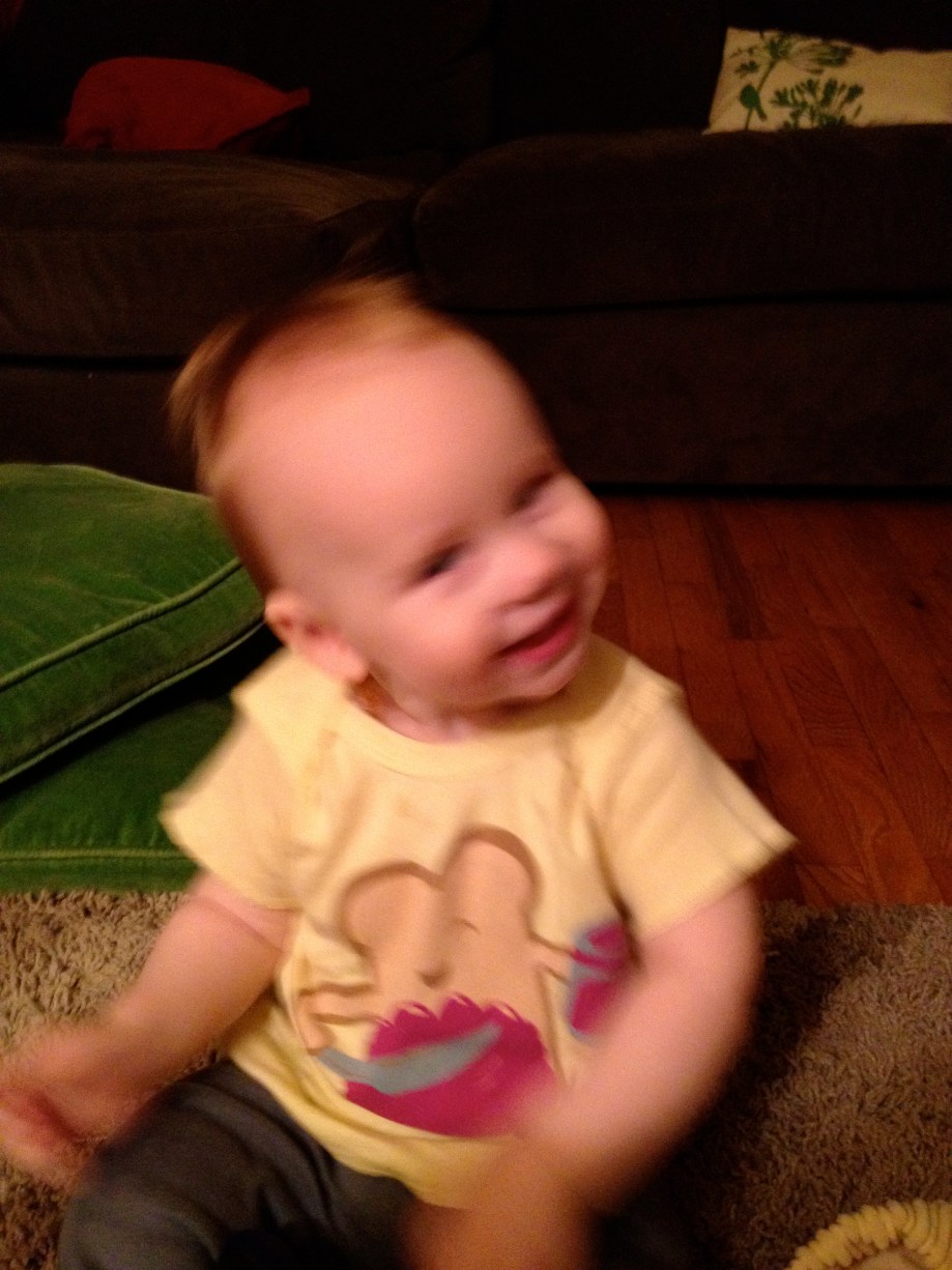 He’s a snotty green mess again and is soaking his clothes with drool, but is happy as a clam and a complete pleasure to be around (except for the whole crying every two hours at night for just long enough to wake me up thing, then he goes right back to sleep while I stay awake, eating and listening to food podcasts). He’s got the milk sign down and is not afraid to use it, is practicing walking with gusto, and eating more than ever: Big fruit smoothie for breakfast (strawberries, blackberries, cherries, banana, coconut, and raw tahini butter), one small roasted yam with cinnamon and coconut oil for lunch, and half an avocado and cucumber slices for dinner, plus milk galore.