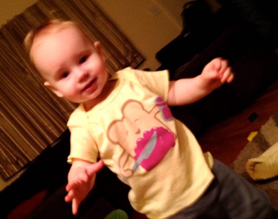 Here’s our little man in his jelly toast t-shirt from Auntie Tiff and Auntie Katie. I know, right? Don’t even get me started on his lobster socks…