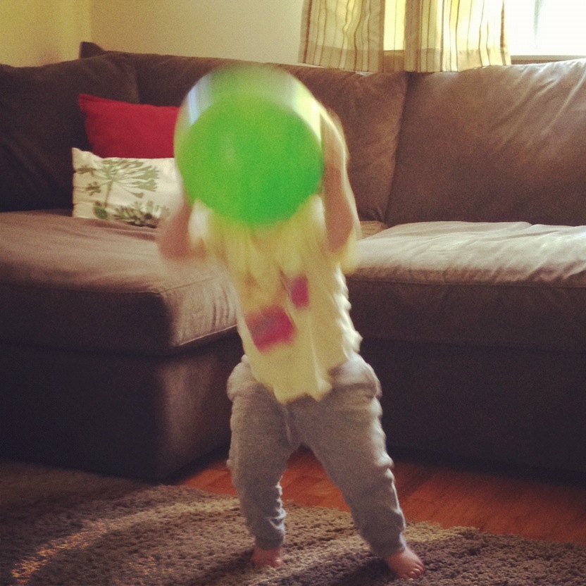 I had to temporarily retire the green bouncy ball he got from his wonderful Aunt Tiffany. Apparently the only way to play with this ball is to bounce it, then kick it while still bouncing. What started out as fun quickly turned to angry mania as he was completely pissed at the ball while simultaneously holding onto it as if his very existence depended on it. Now it’s taking a time out in the laundry closet.