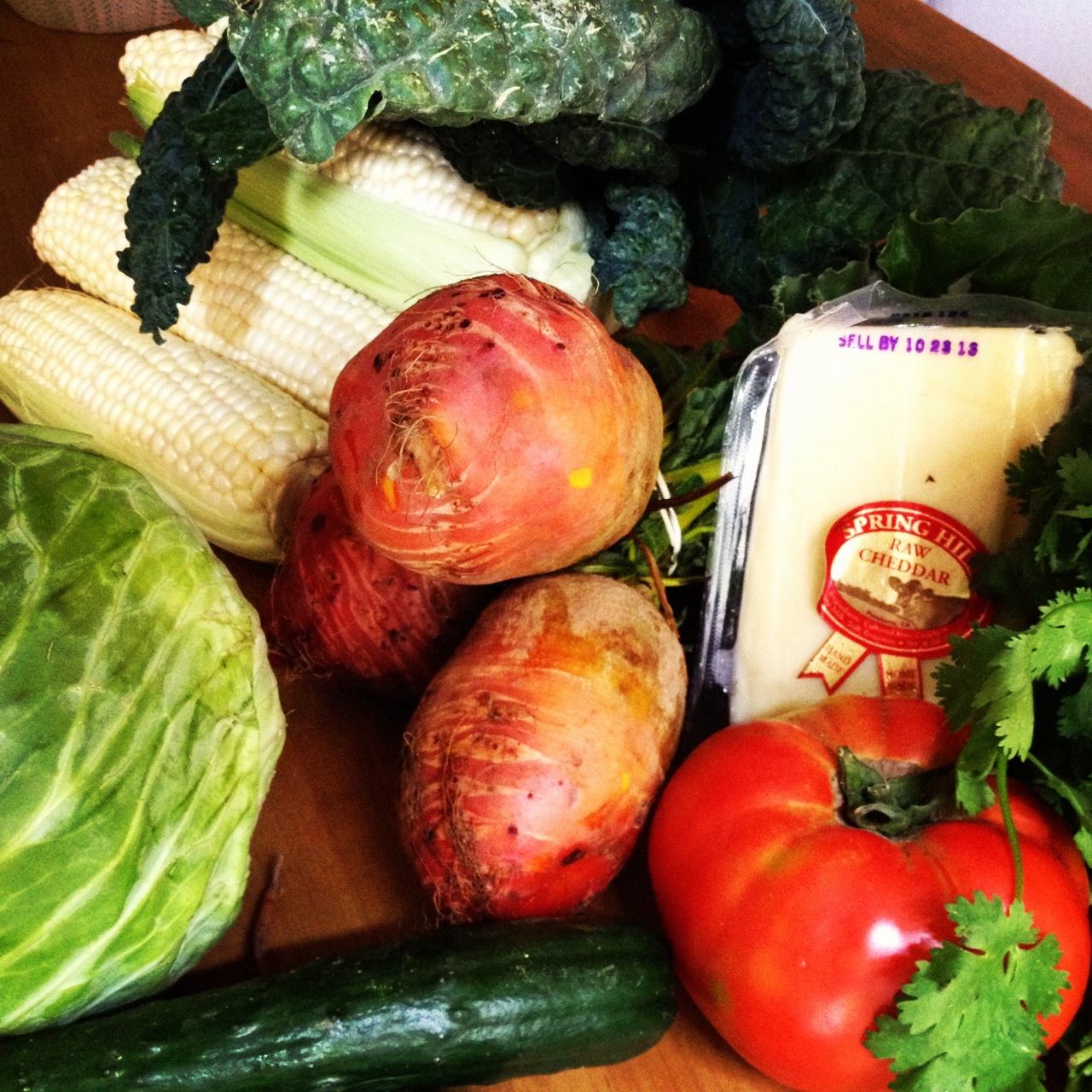 Most of this went into the salad. The tomato still needs to ripen, the cabbage and kale are destined for soup, and the cheese is all Ian.