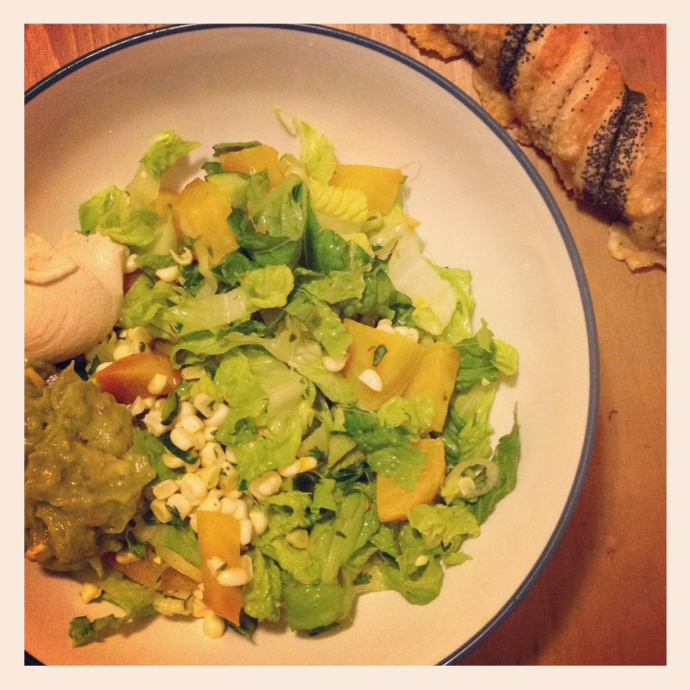 Super clean, super tasty. I like to “dress” this salad with fresh guacamole and hummus, and add a big slab of bread to dig into, since I’m having salad for my meal and all…