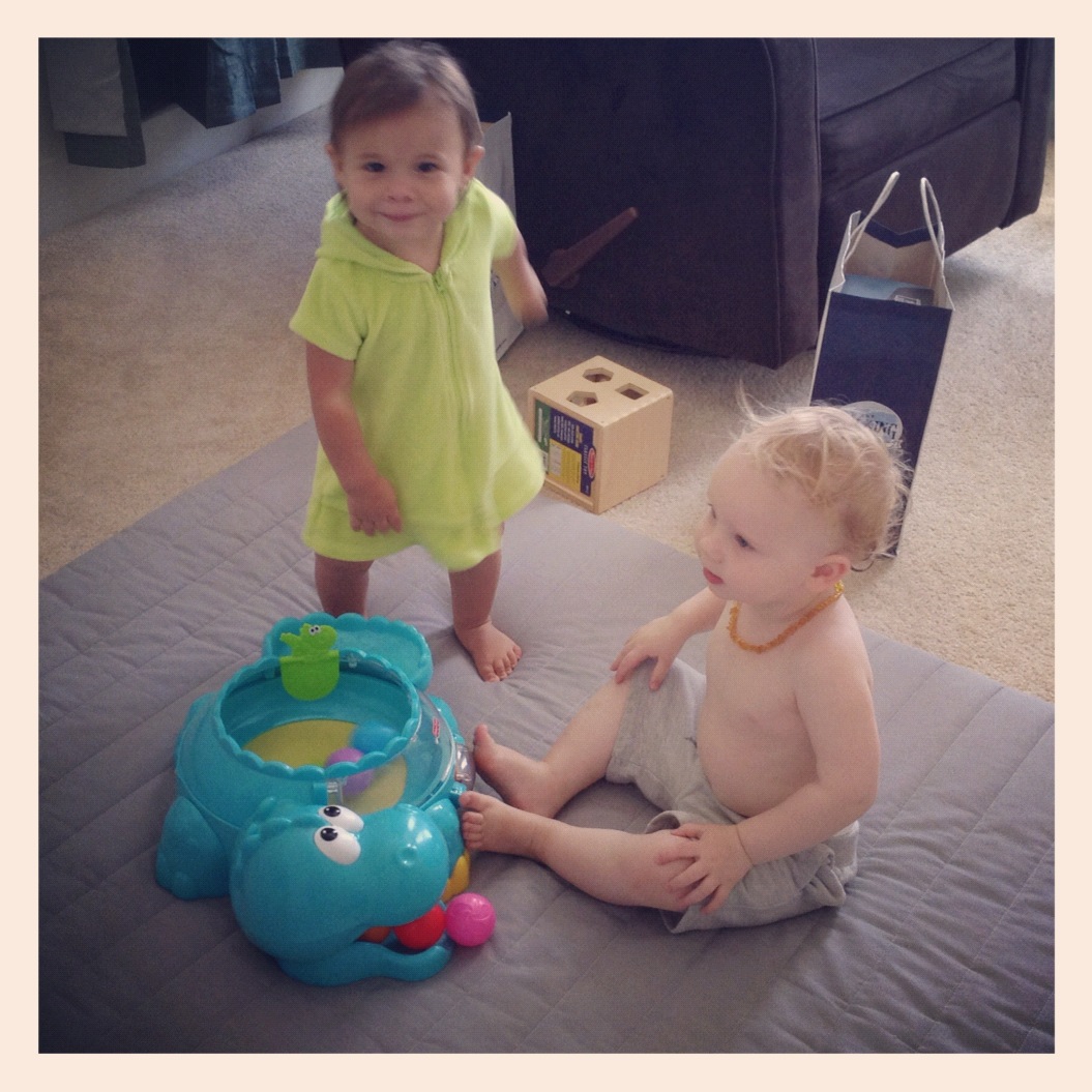 I did catch some play time on the flip side. Mila’s feeling the music while Ian’s busy pelting balls. What else is new?