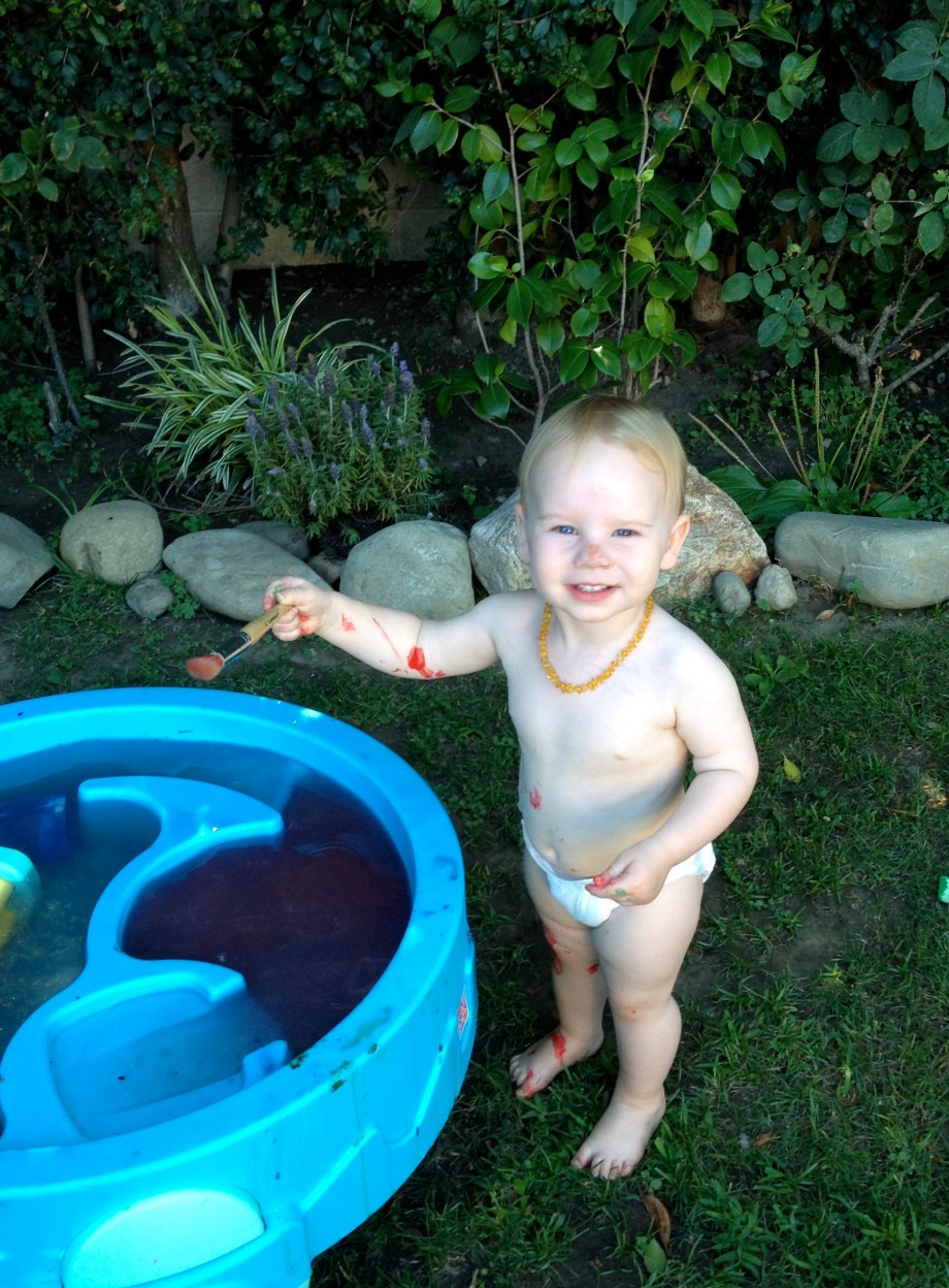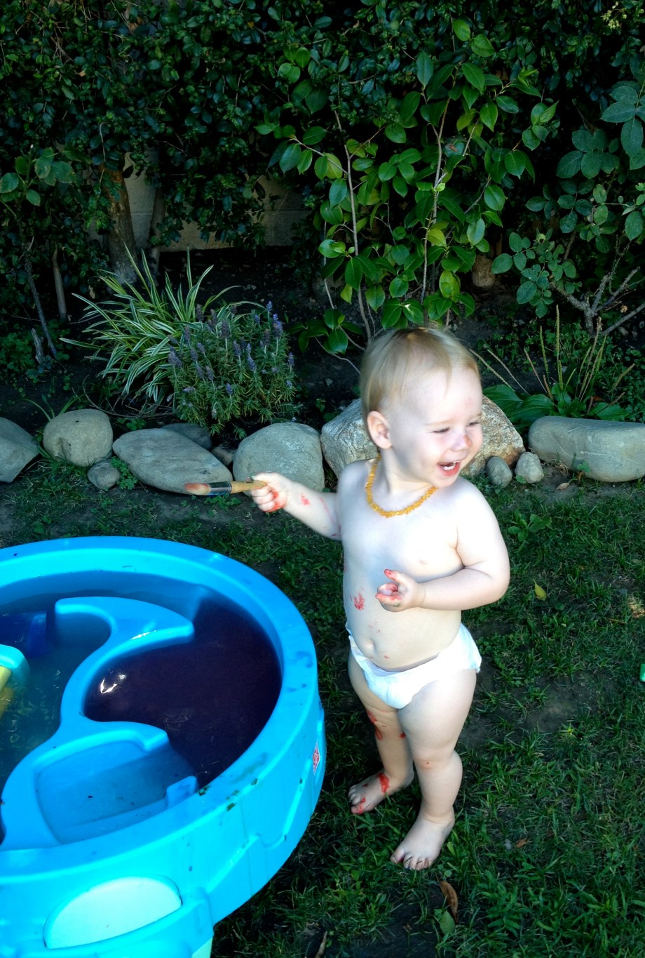 We went right for the red paint, then the water table. Oh, and his nose has a big old scab. He dove for the soccer ball on Monday night and face planted into the cement. He was very committed.