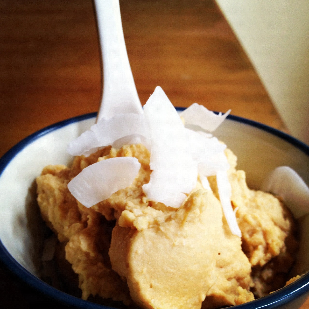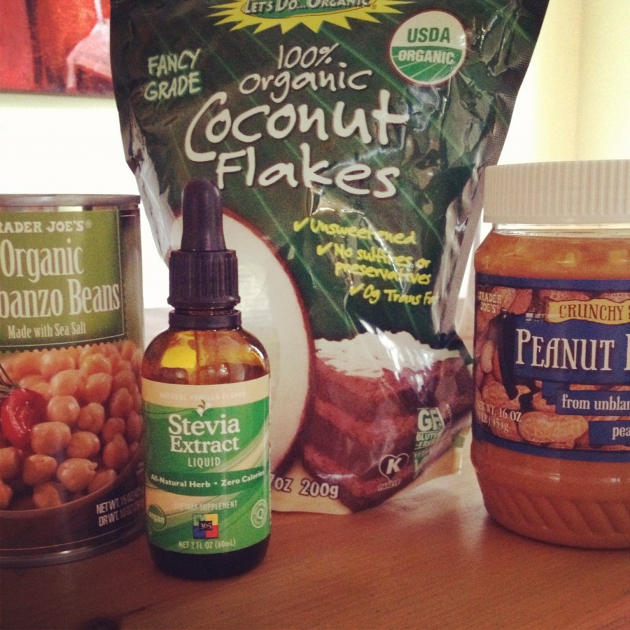 Bust out your blender. Rinse and drain those peas good. If you’re fancy and don’t have a toddler screaming for scrambled eggs, you can pop the peas out of their shells and discard (this makes the dough extra creamy). Shells on doesn’t bother me one bit. Add peas, peanut butter, and stevia and blend away. Add almond milk little by little until you get desired consistency. Stir in coconut.