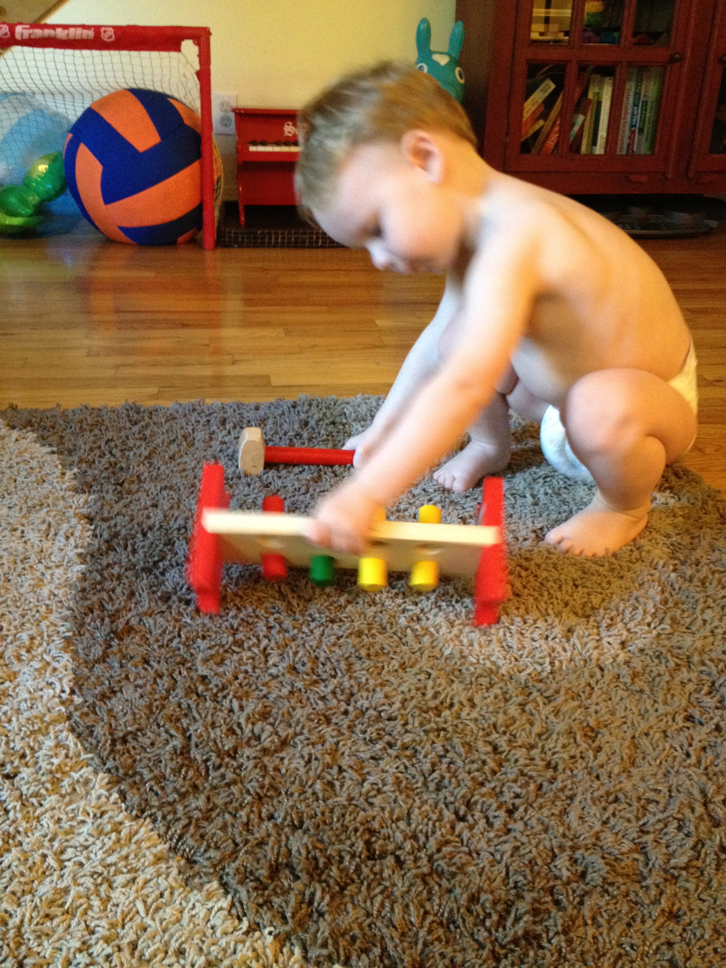 I had to document Ian playing with a toy as it was designed to be played with. We are not throwing the pegs or using the hammer as a golf club. This still happens (especially the golf club part), but in recent weeks Ian has shown an interest in puzzles, stacking, and other task oriented toys, rather than just balls balls balls balls balls. I mean, balls are still number one, but we have progress nonetheless.