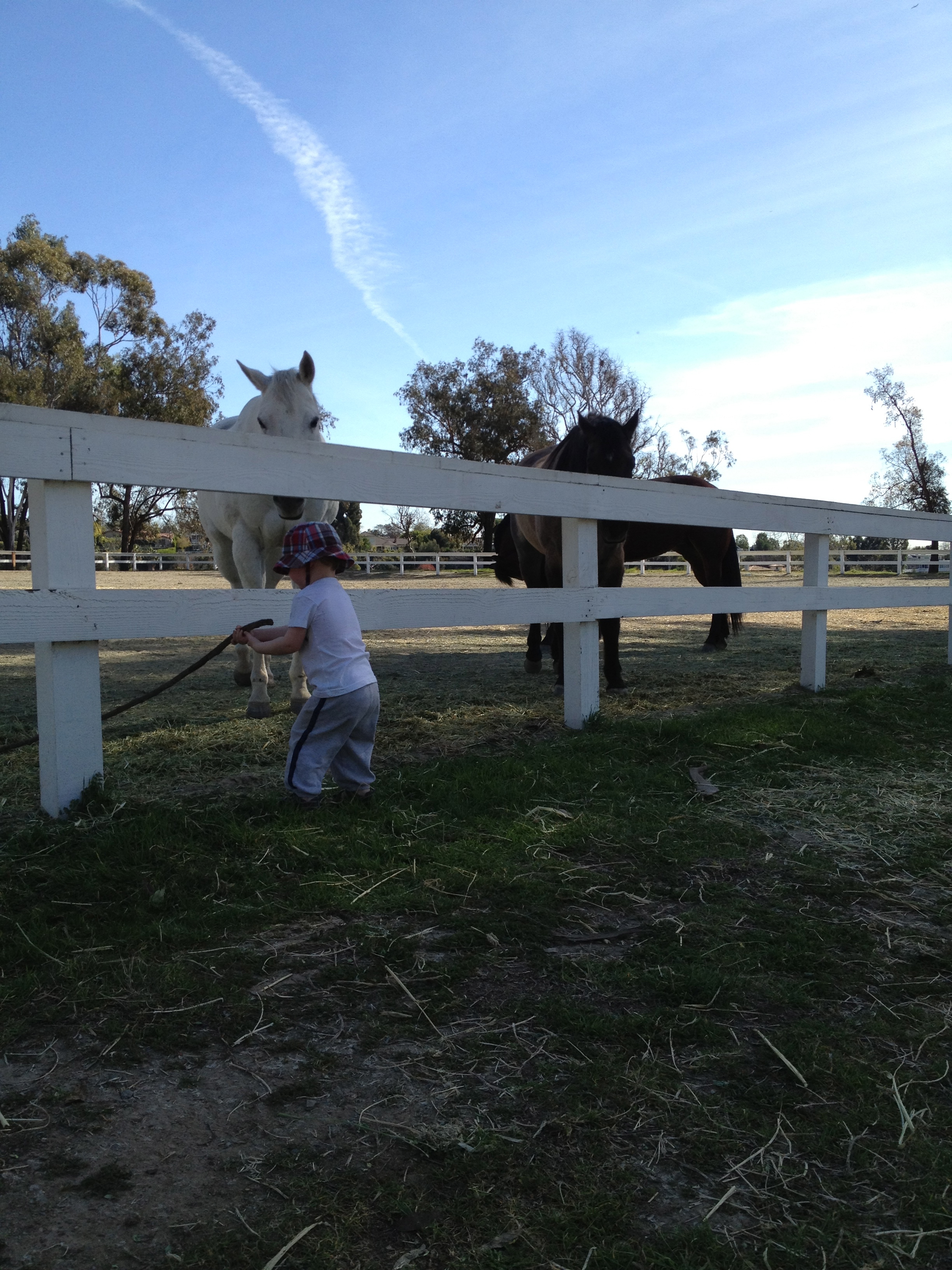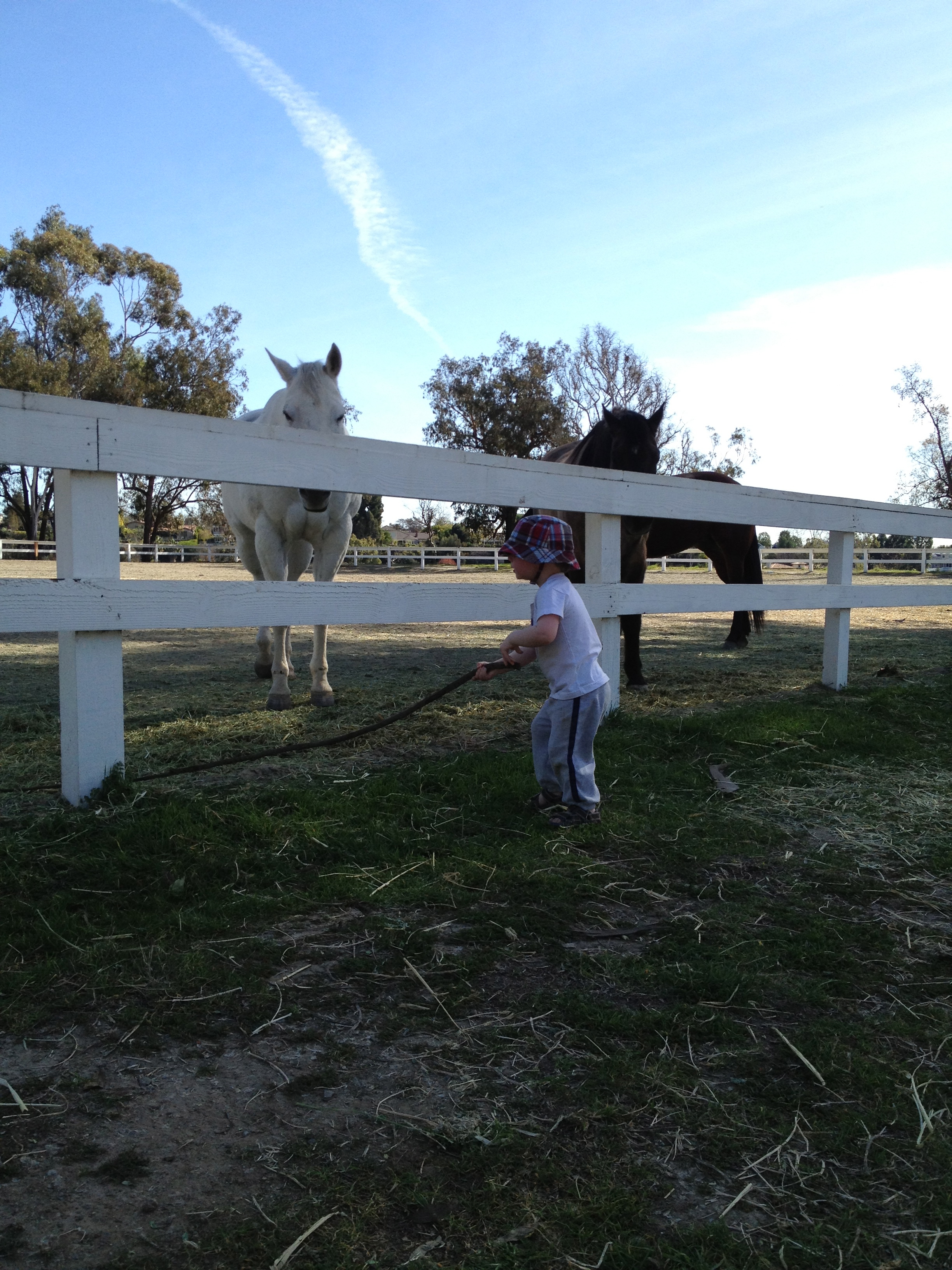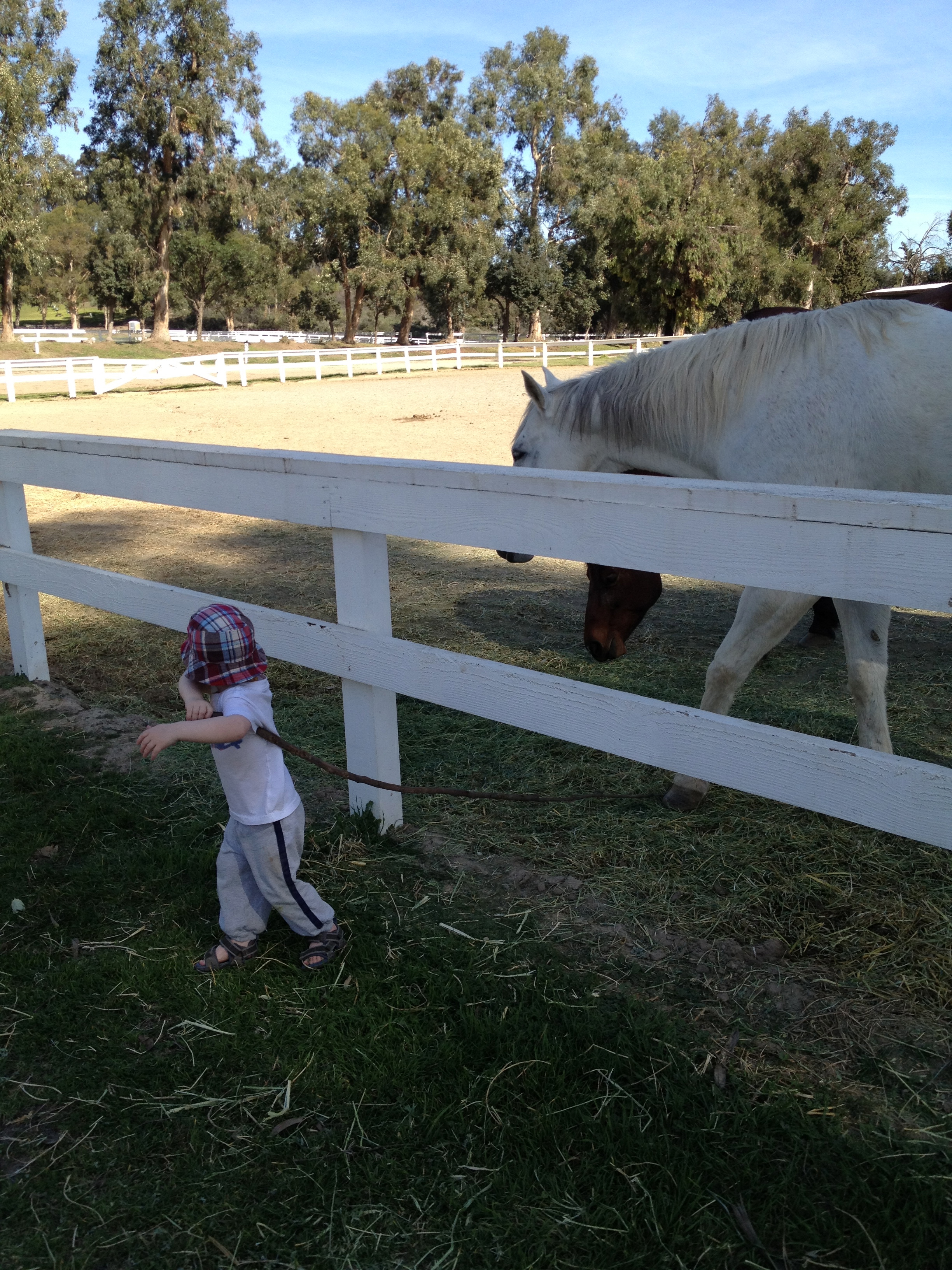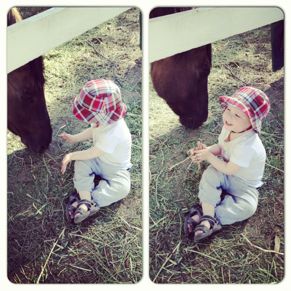 The horses were so cool. He fed them hay for a long time. Then he found a big stick and started to “fish.” I kept telling him if he hit a horse with the stick, no more stick. Well, that’s what happened at the end of the video. Tears followed. The horses were unharmed. We’ll be back. With carrots. And no sticks.