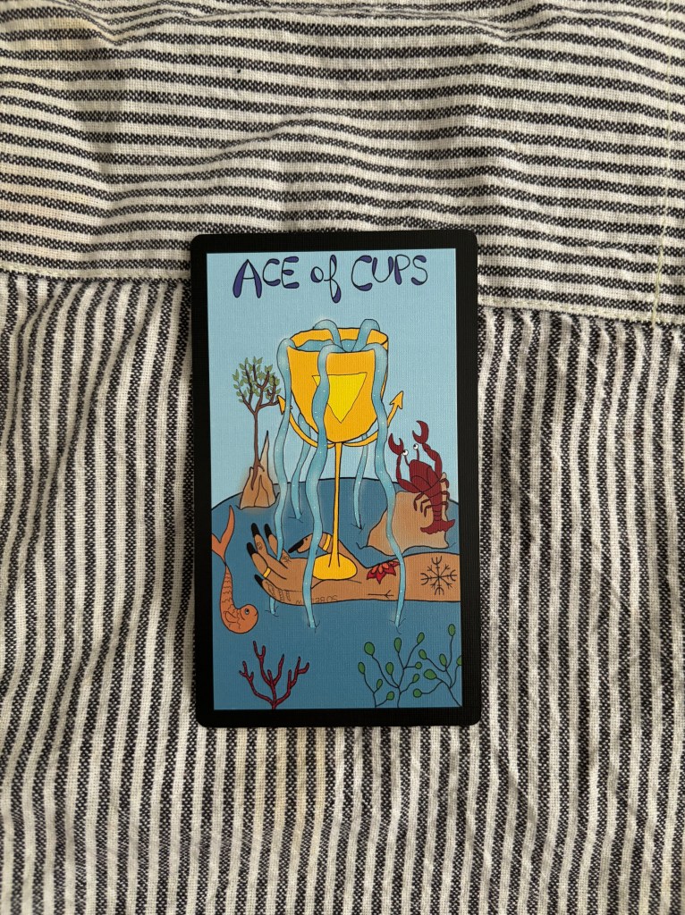 The suit of Cups is in the element of water: Feelings feelings feelings, and the Ace represents that energy in its purest and most potent form. Pulling this card can signify new love and all it’s sparkly potential. It’s that moment when you catch yourself smiling, your chest feels warm and full. If you’ve been through some turmoil, this card is letting you know the fresh start is arriving. An emotional reset is here to give you some breathing room as your heart opens again.