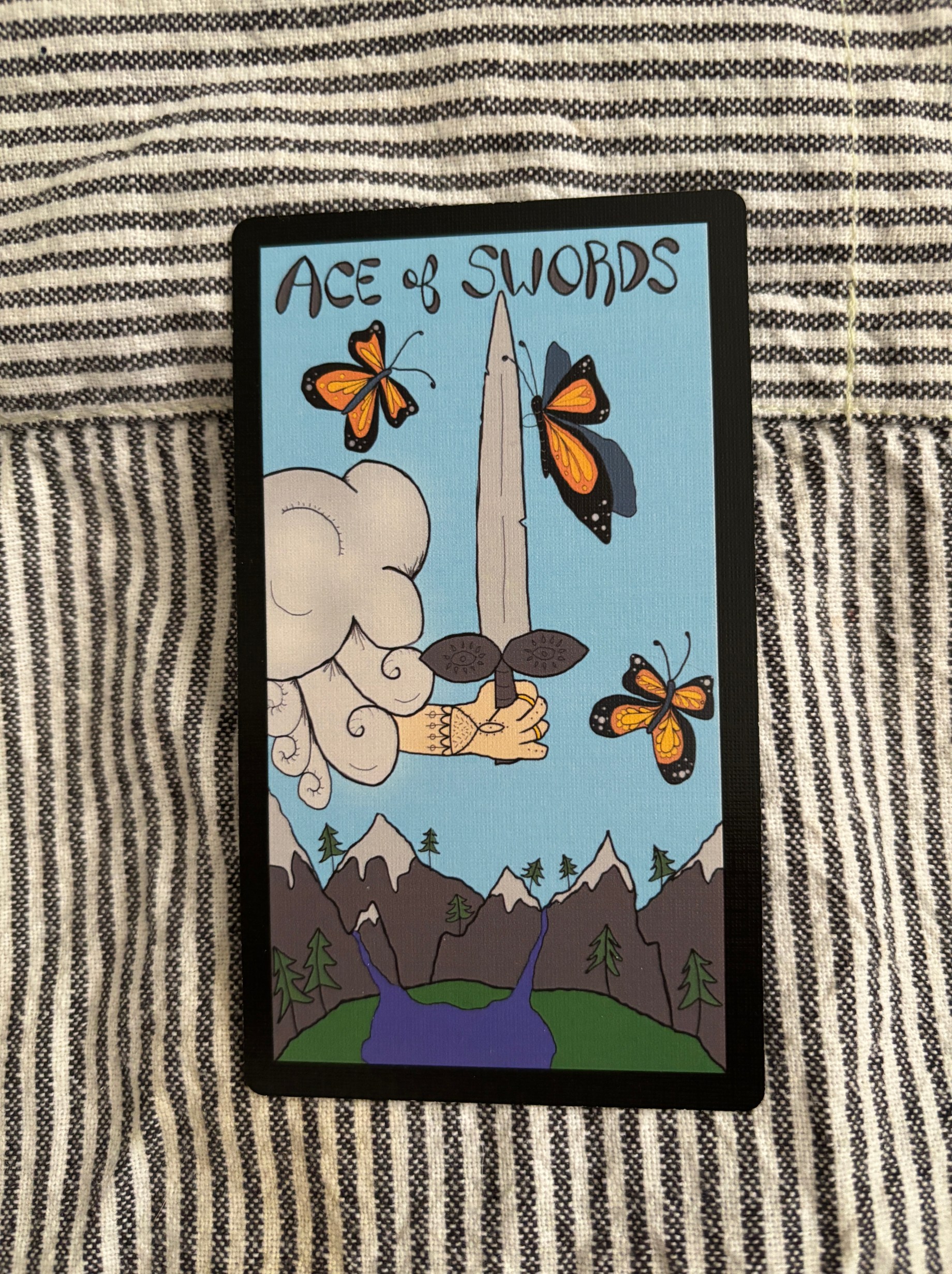 The suit of Swords represents our mental acuity. Our ability to think and communicate. It is associated with Air signs (Gemini, Libra, and Aquarius). I find the suit of Swords to have the highest amount of challenging cards (maybe it is the lack of Air I have in my natal chart), but this card represents new ideas, new intellectual potential. Opportunities to think, grow and learn are present. If this card is pulled in answer to a question of pursuing something new, this card says YES. As with all Aces, this card symbolizes the beginning, and you will experience breakthroughs and success if you stay the course.