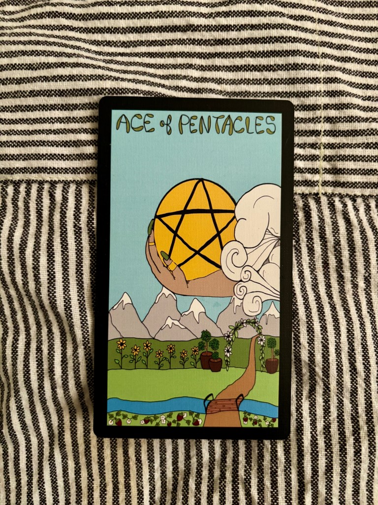 The suit of Pentacles represents all that is material and earthly; home, our body, our health, resources, finances, and livelihood. When the Ace of Pentacles appears, it signifies new prosperity and invites us to trust what is coming in. It is real. It will materialize. Follow the path.