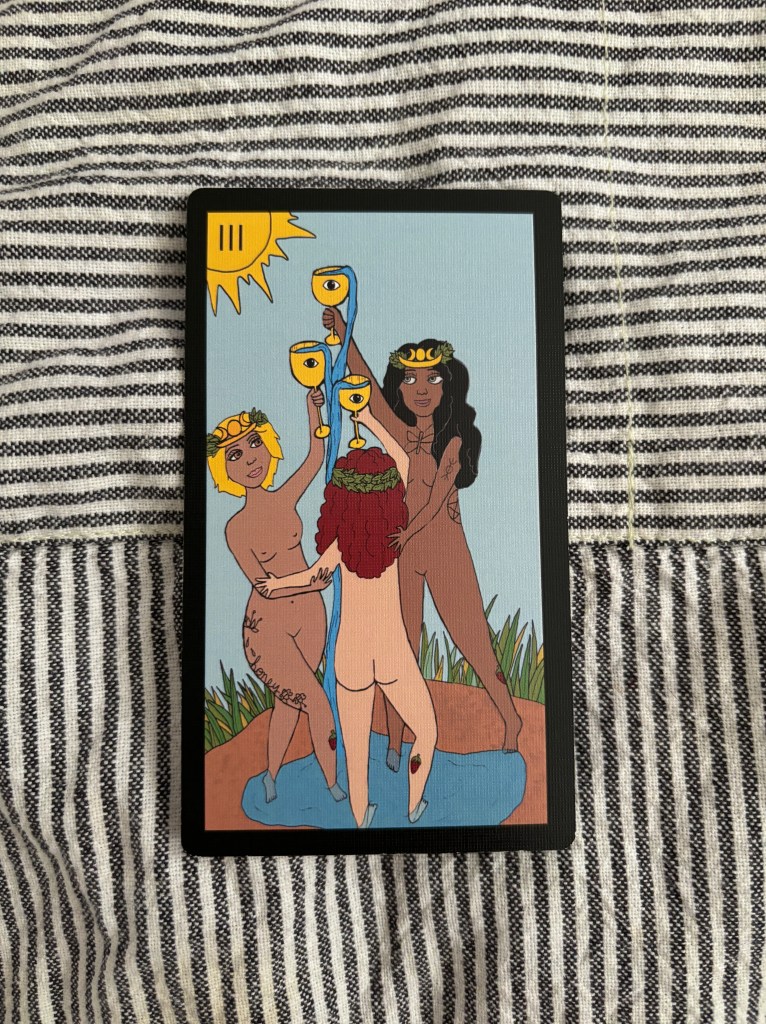 One of my faves, the Three of Cups is like the moment your social anxiety goes away you start having fun at the party. You have found your people. You have come together to work towards the same emotional goal. You can truly be yourself. You are welcomed just as you are, and you do the same for them. Love fest!