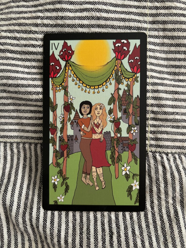 Freedom. Celebration. Where two or more are gathered, we are open to receiving divine messages. Four of Wands calls for acknowledging the goodness that surrounds you. Acknowledge how you have grown and have gratitude for the souls that have supported your journey. It also signifies the best kind of love; you are enveloped in someone’s support AND you feel free within that. Free to continue to grow and shift, which they will witness and vice versa. Loving with the lightest hand.