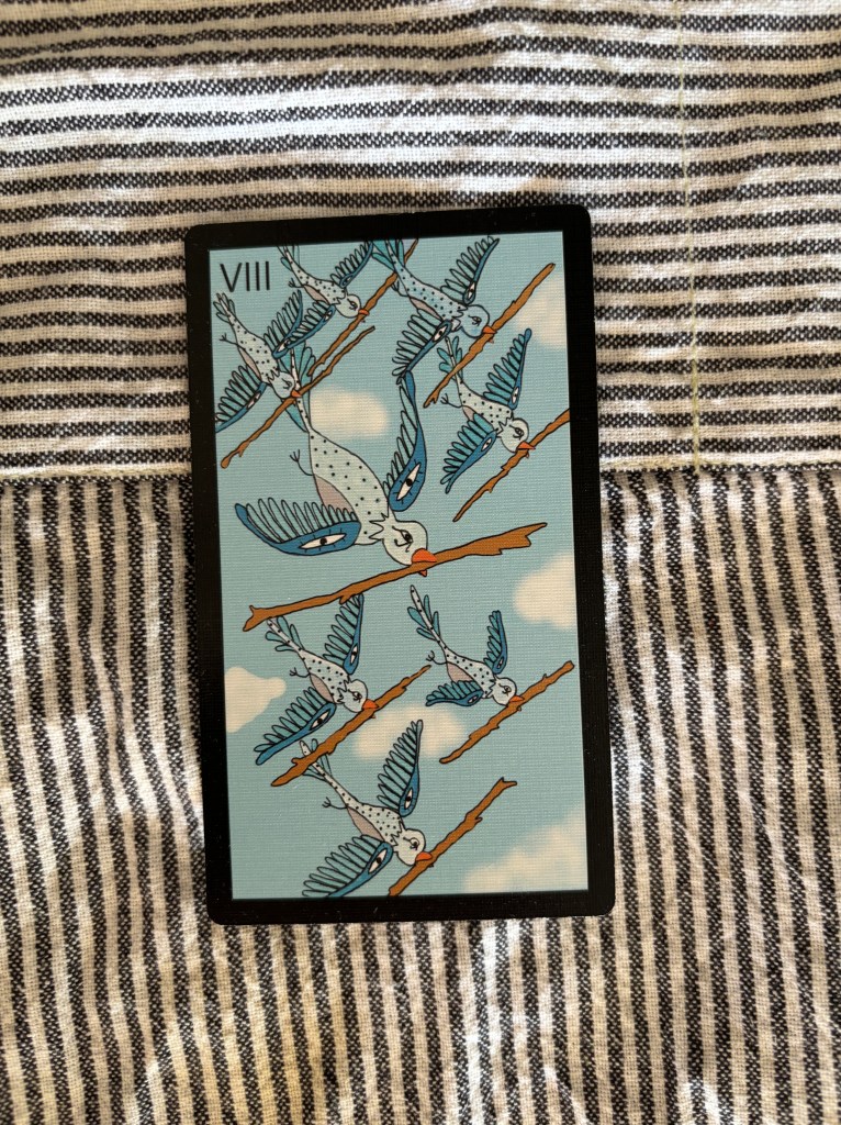 Action! News! Things are happening. This card indicates rapid forward movement. If you are stalling on a project or a decision, the time to act is now. Make a choice. If you are in the midst of a journey, keep going, you are on the right track. Maybe pick up the pace a bit. Get your life!