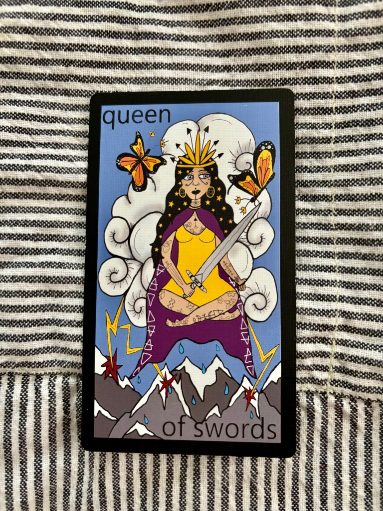 The ultimate truth teller (whether we want to hear it or not). She represents wisdom, intellect, and clear judgement. She is fair and objective. The opposite of Cups (emotions), she leads with her head and her communication style, which is direct. She is powerful medicine.
