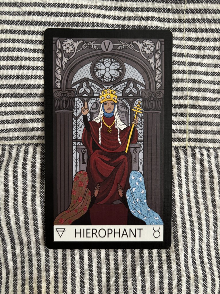 Religious leader imbuing what is sacred, what is traditional, what is morally just. When this card comes up, it can suggest there is a teacher or mentor present that will have a great impact. It can also suggest that you are doing what you have always done, and depending on where this shows up in the tarot spread, it could suggest looking at your patterns to see if they are working for you. If you are only doing things or making choices based on what you’ve done in the past, it may be time to evolve past that. This card can also serve as a call to dig deeper. Just because someone appears holy and “good” does not mean they actually are. It may be time to search your heart and decide for yourself what YOU believe.