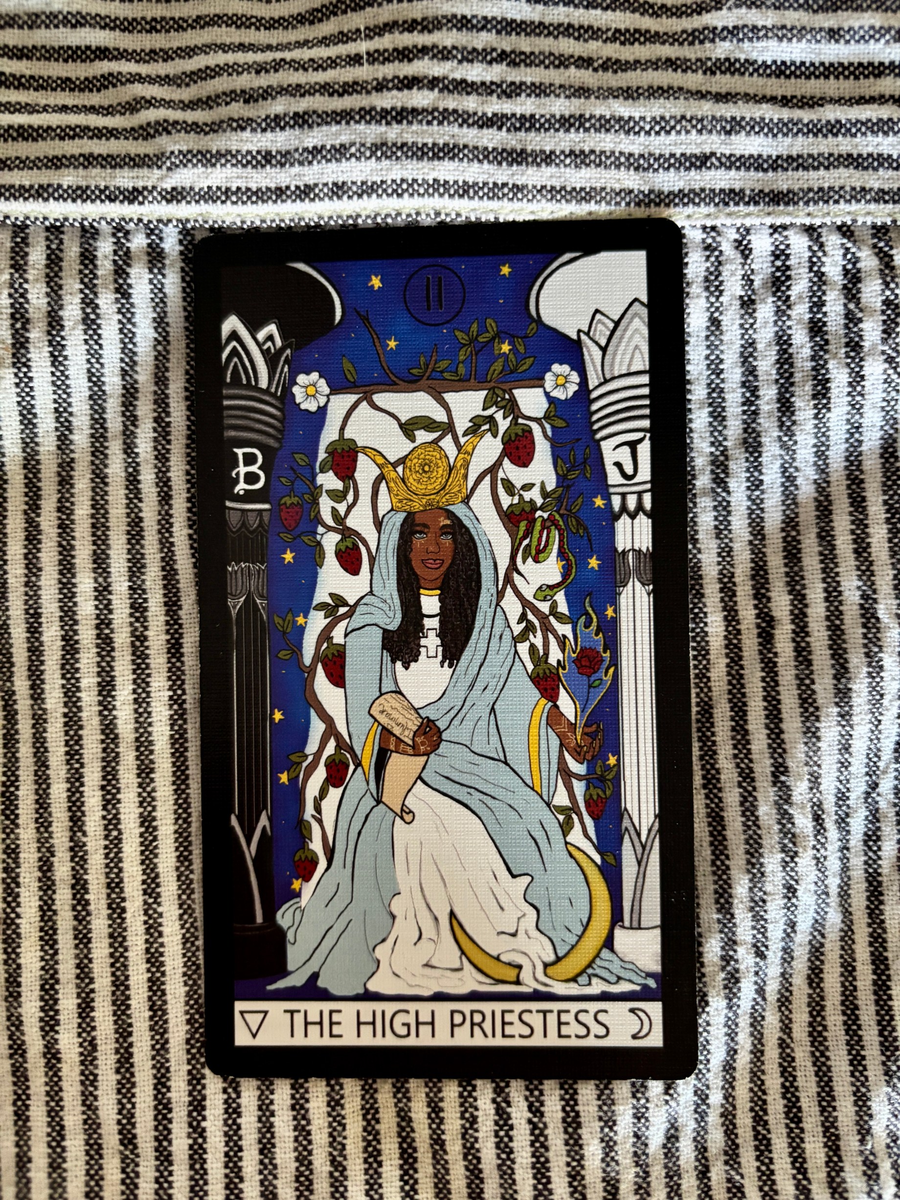 If this card comes up as a guide, it is asking you to go inward and listen to that still small voice before you make a decision. This is a card of stillness and indicates now is not the time for action. She is deeply wise and is the voice of The Magician. She holds powerful magic and guess what? All of that power is within YOU. Breathe it in.