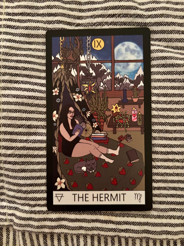I was inspired by The Tarot Diagnosis podcast to take a deeper dive into The Hermit and how to work with it in the coming year (my initial thought was just cool cool cool let’s all retreat into our respective caves and create things we may or may not eventually share, which appeals to the part of me that isolates but is probably not what the Universe ultimately wants for me or for any of us).
